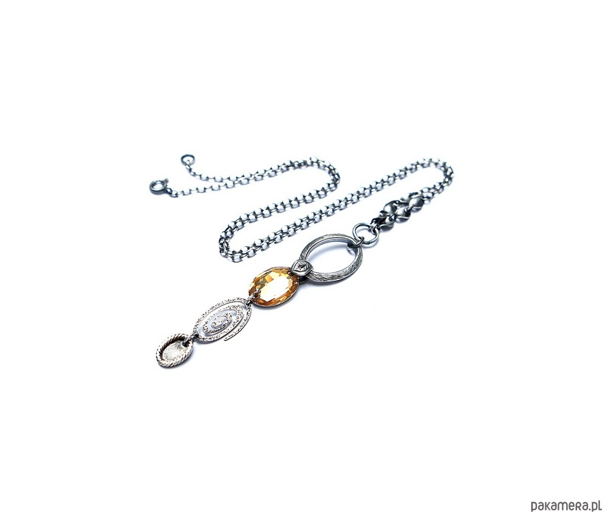 Naszyjnik wykonany ze srebra [pr. 925] w połączeniu z różnej wielkości blaszkami i ogniwami oraz kryształkiem Swarovski. Srebro oksydowane i przetarte. Całkowita długość naszyjnika około 49cm; długość części wiszącej: ok. 7cm. Biżuteria ozdobnie zapakowana.