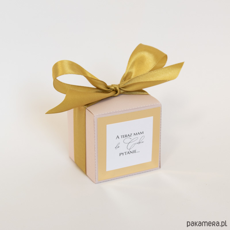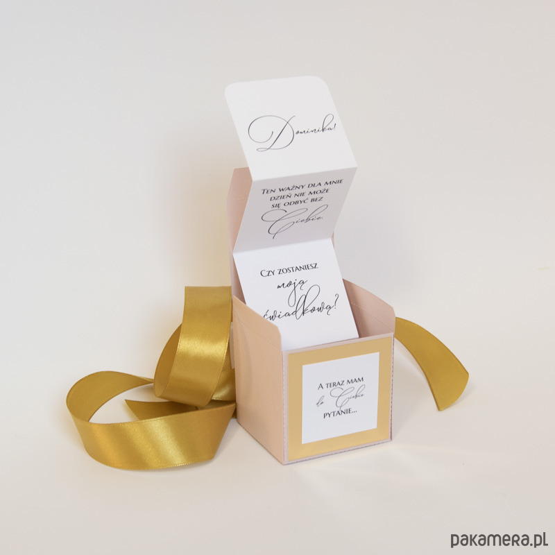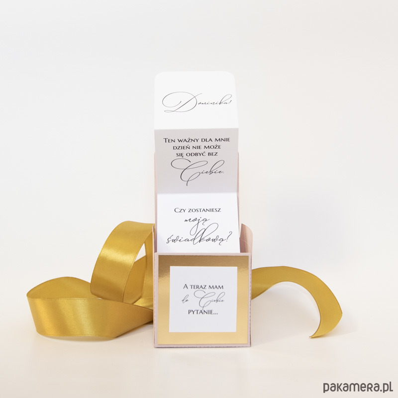 Zaskocz swoją przyszłą świadkową miłym gestem i poproś ją o świadkowanie w nietypowy sposób! Pudełeczko skrywa w środku harmonijkę z tekstem prośby i imieniem Twojej siostry czy przyjaciółki. Pudełeczko wykonane jest ze sztywnego papieru w kolorze bladoróżowym ze złotymi detalami.
