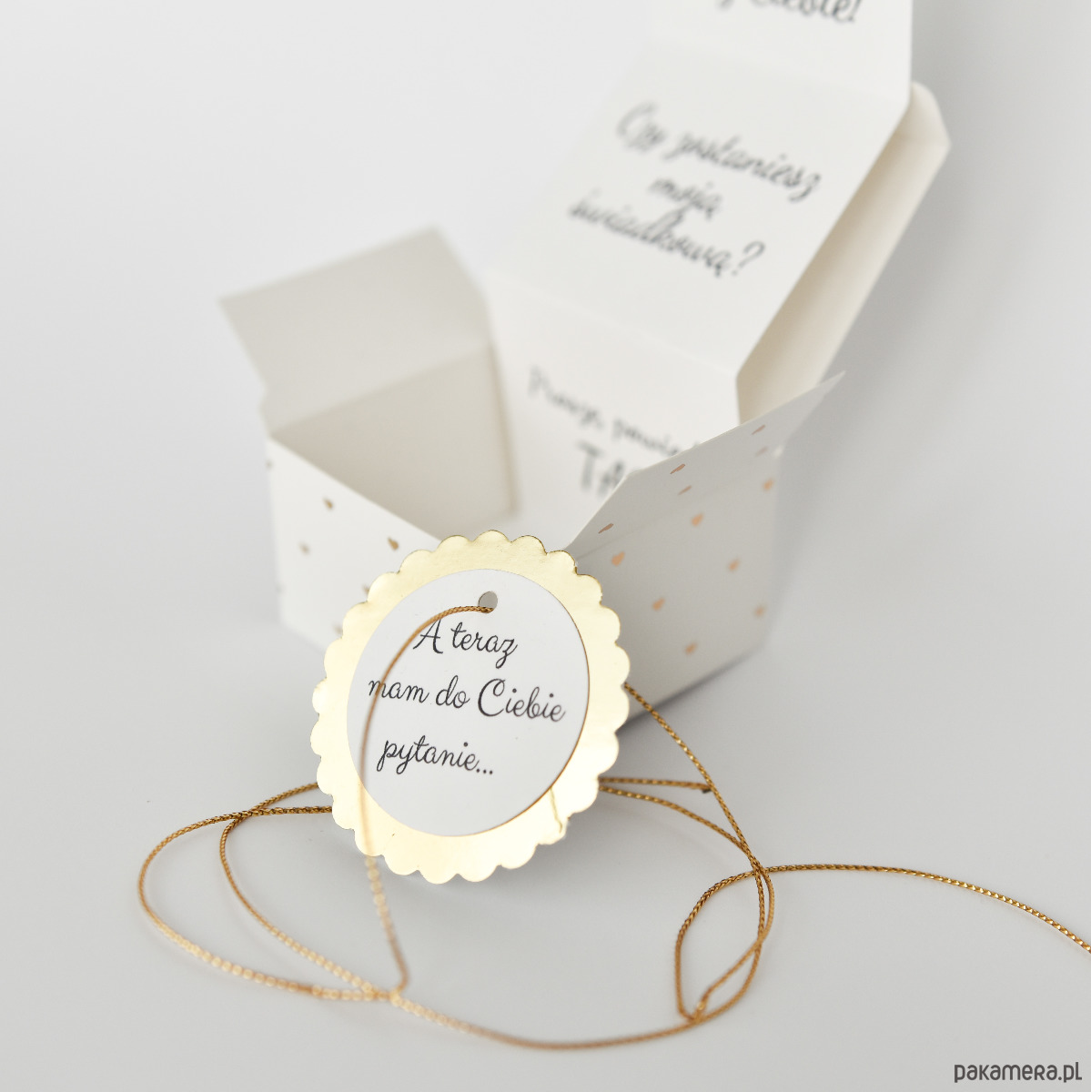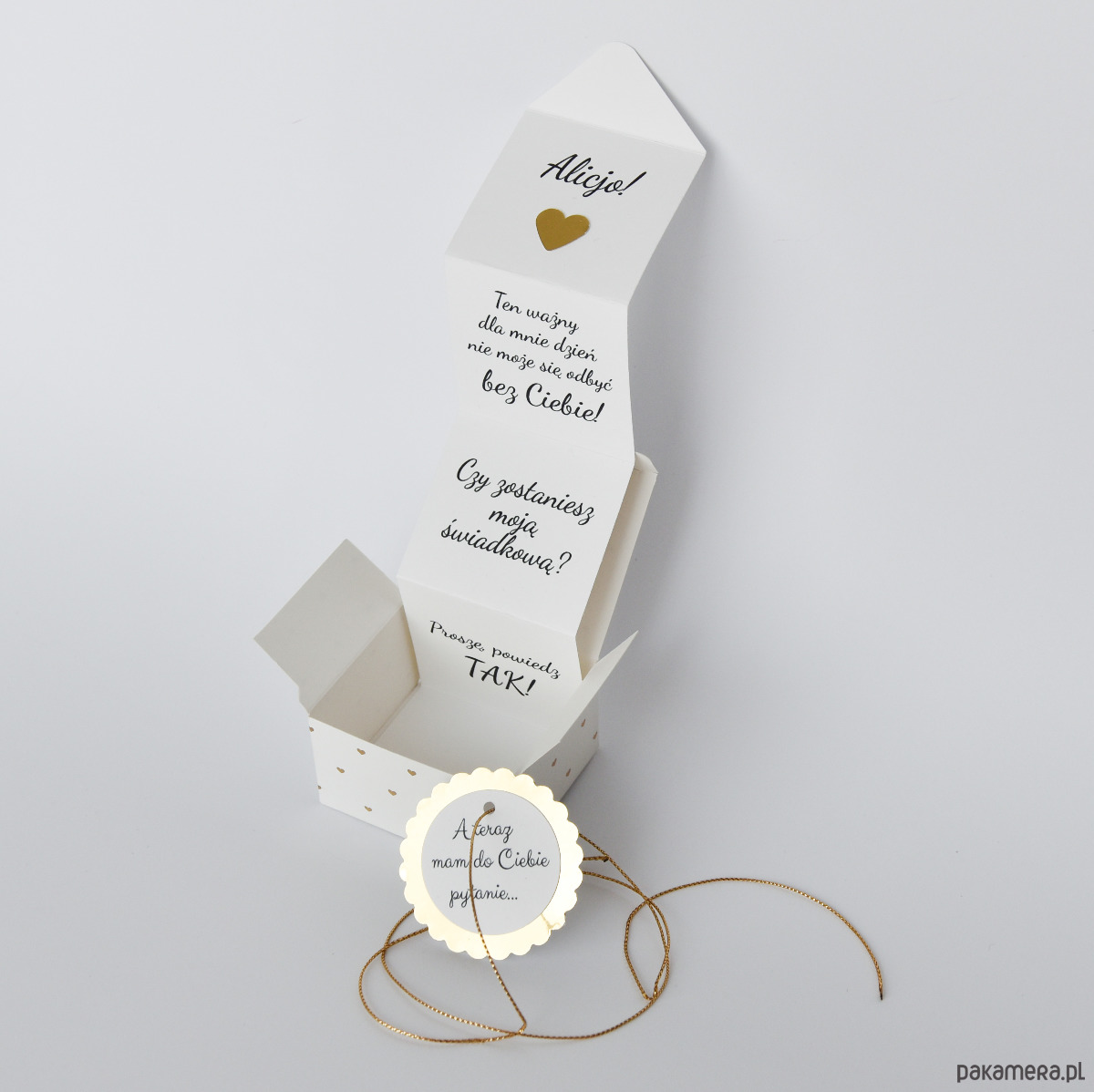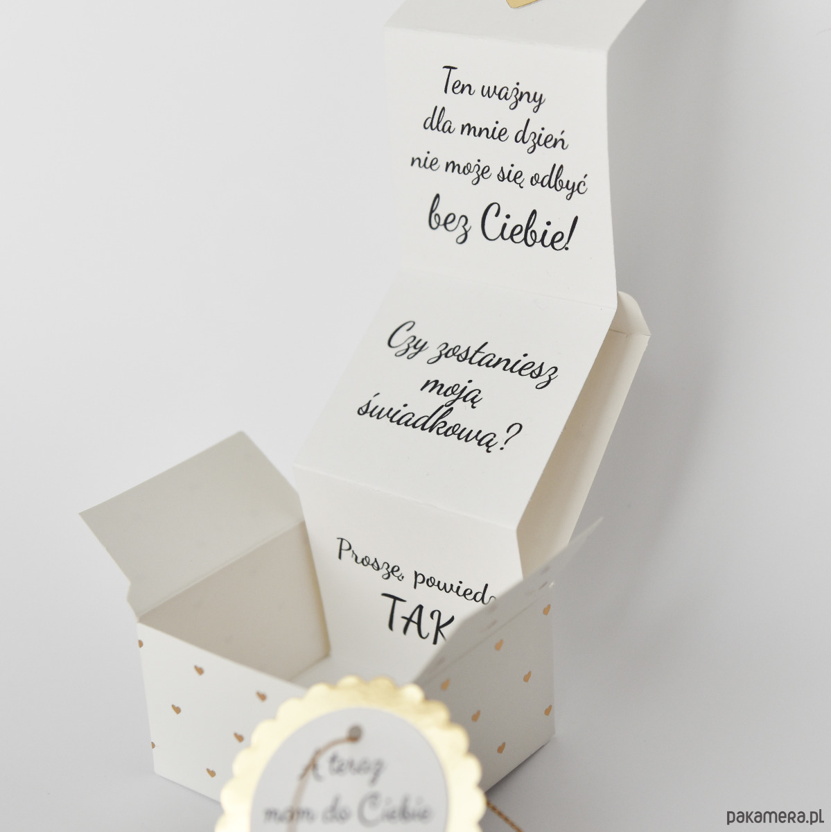 Zaproszenie w formie pudełeczka z wyciąganą do góry harmonijkową kartą z tekstem. Wymiary pudełeczka to ok 6 x 3,5 x 5,5 cm, zdobione jest złotymi detalami i sznureczkiem z okrągłą zawieszką. Zaproszenie będzie nietypowym pomysłem na poproszenie o świadkowanie na ślubie.