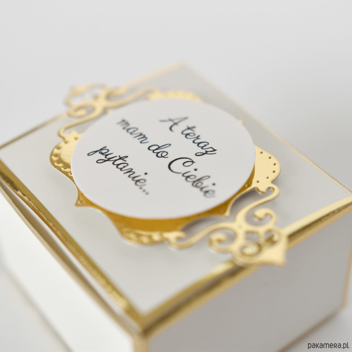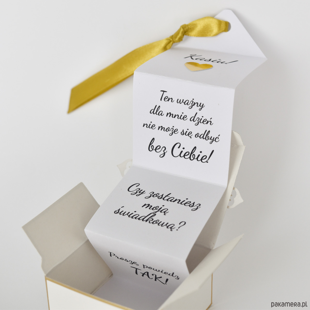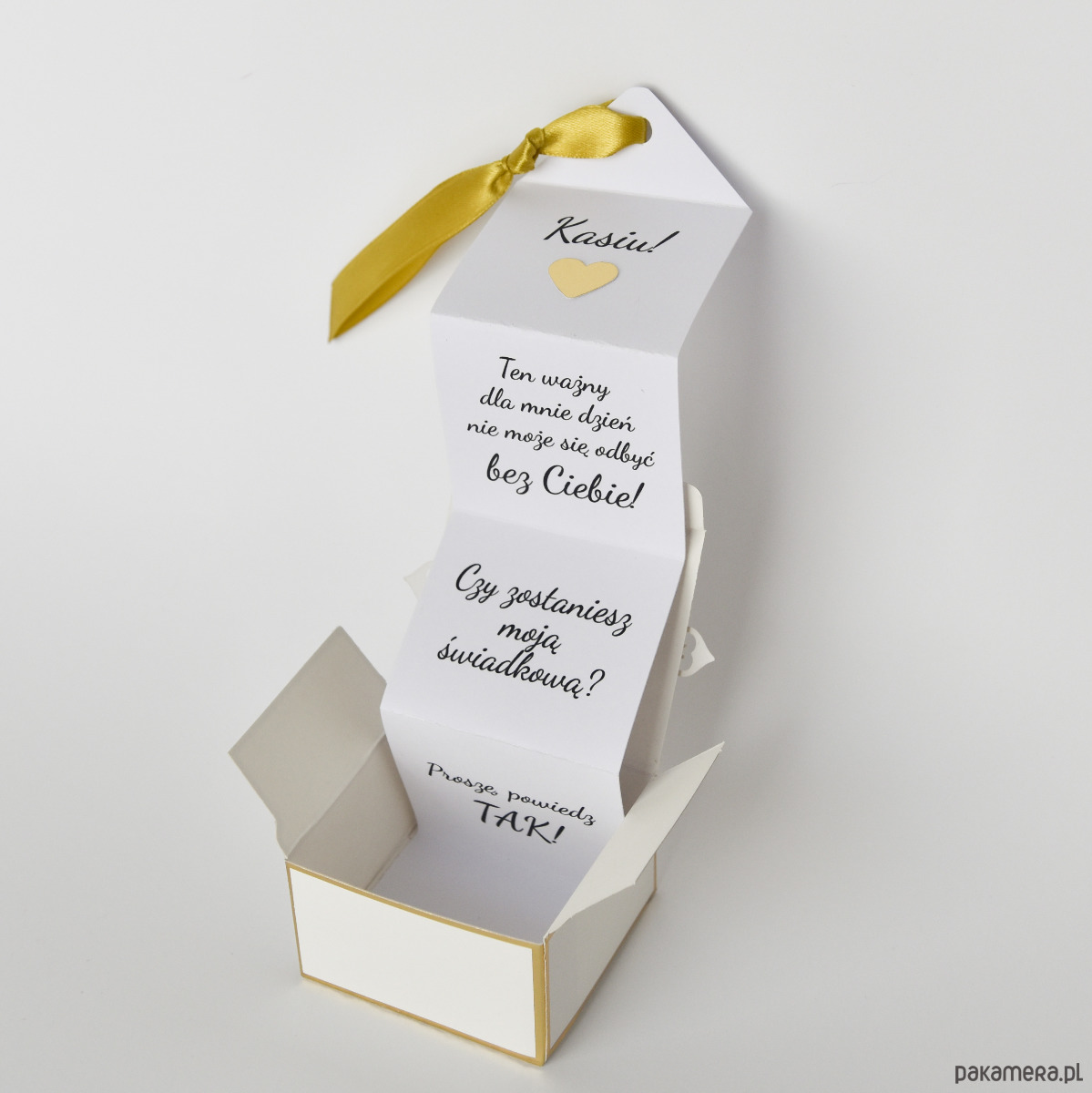 Zaproszenie w formie pudełeczka z wyciąganą harmonijkową kartą. Wymiary pudełeczka to ok 6 x 3,5 x 5,5 cm, zdobione jest misternie wyciętym złotym ornamentem. Zaproszenie będzie nietypowym pomysłem na poproszenie o świadkowanie na ślubie.