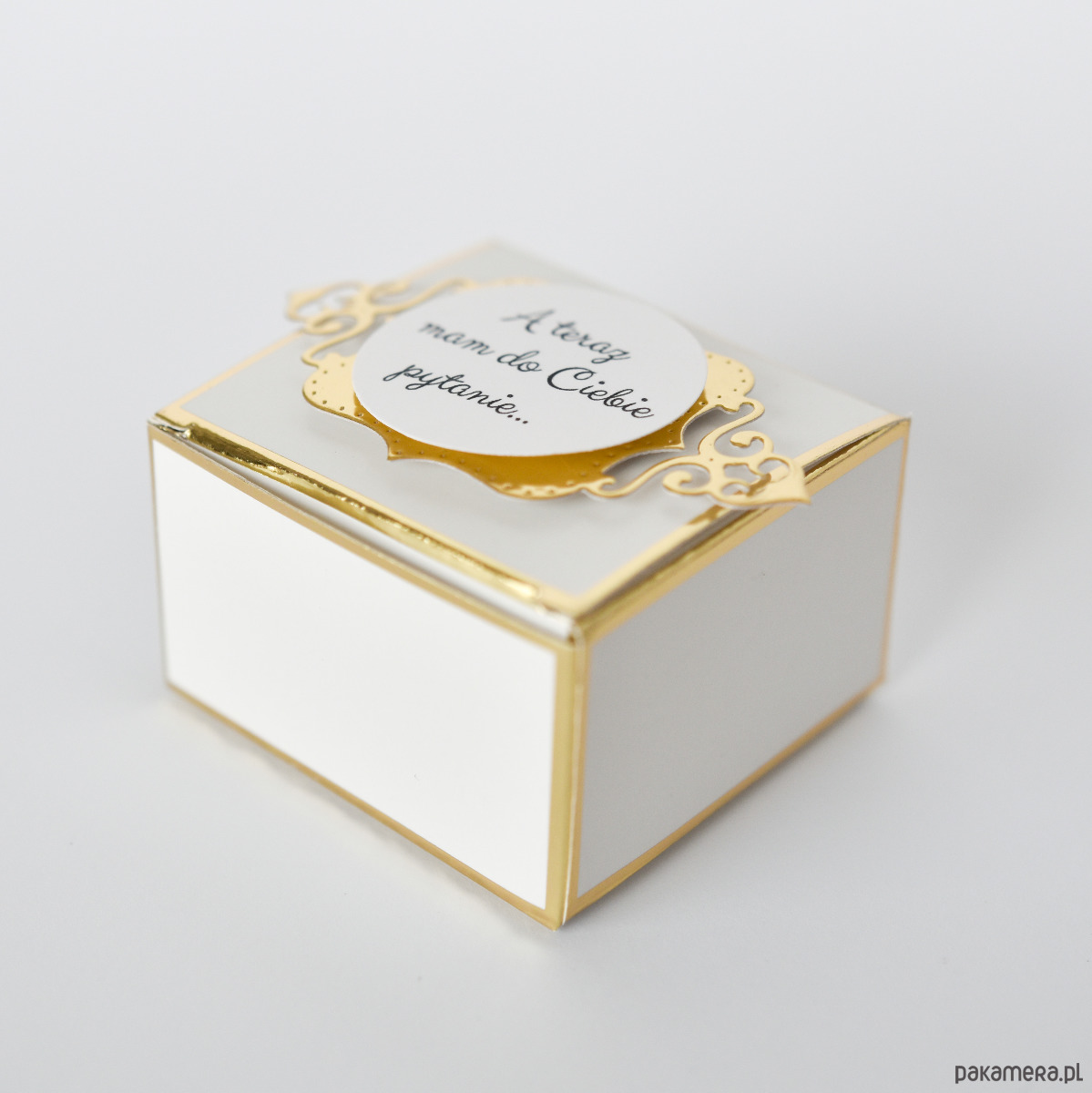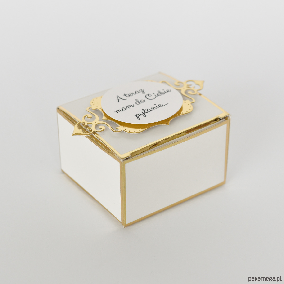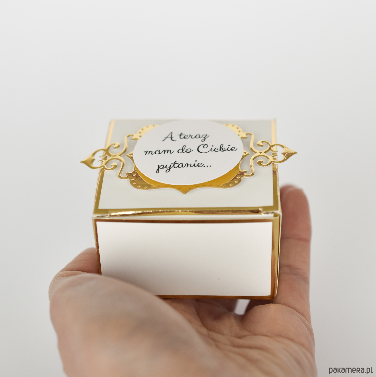 Zaproszenie w formie pudełeczka z wyciąganą harmonijkową kartą. Wymiary pudełeczka to ok 6 x 3,5 x 5,5 cm, zdobione jest misternie wyciętym złotym ornamentem. Zaproszenie będzie nietypowym pomysłem na poproszenie o świadkowanie na ślubie.