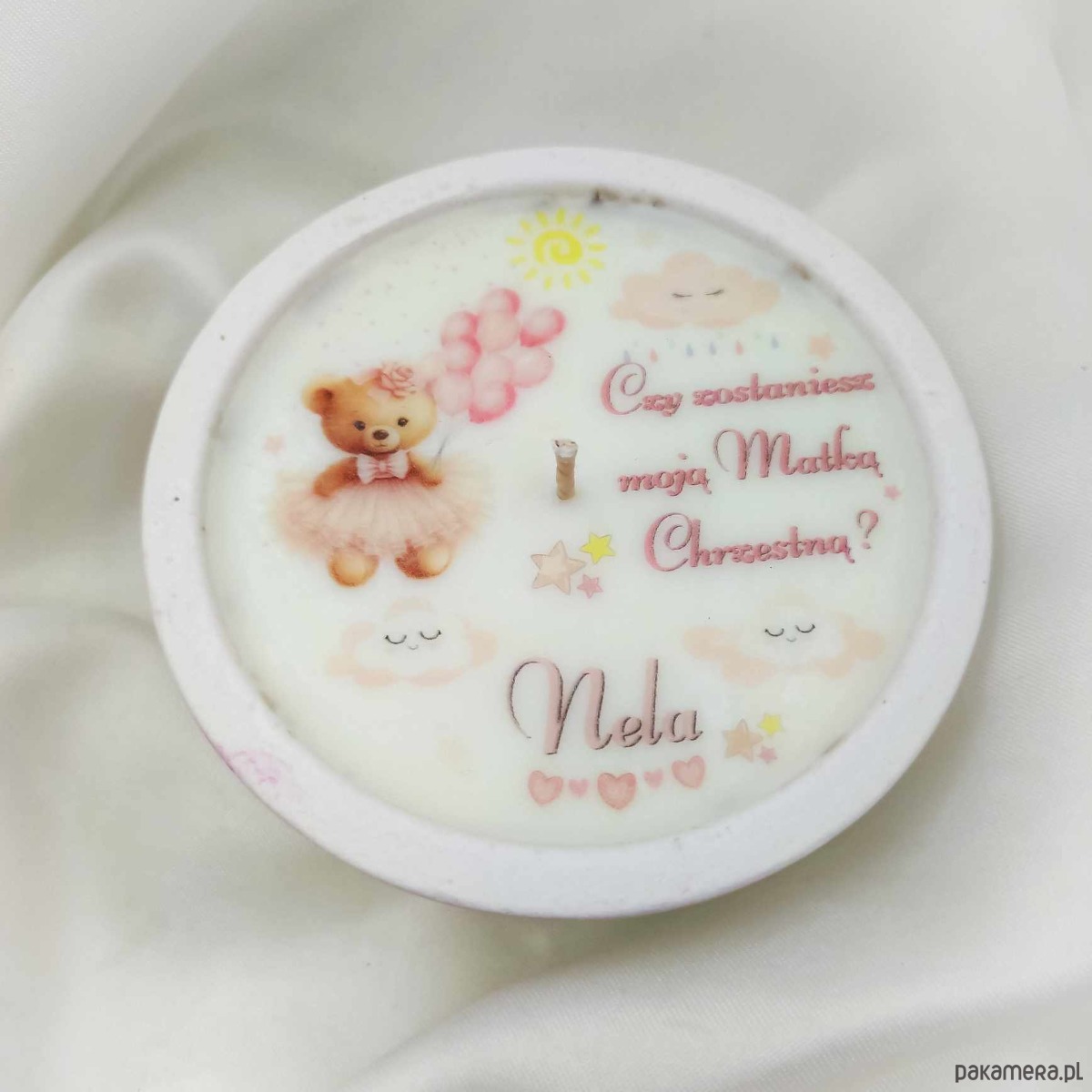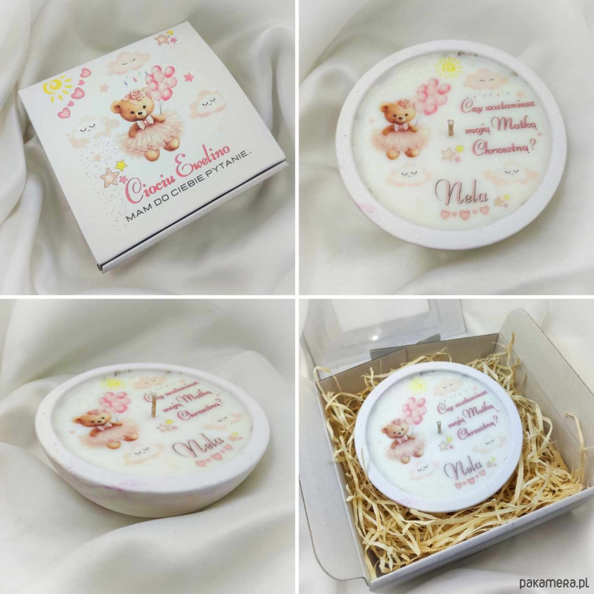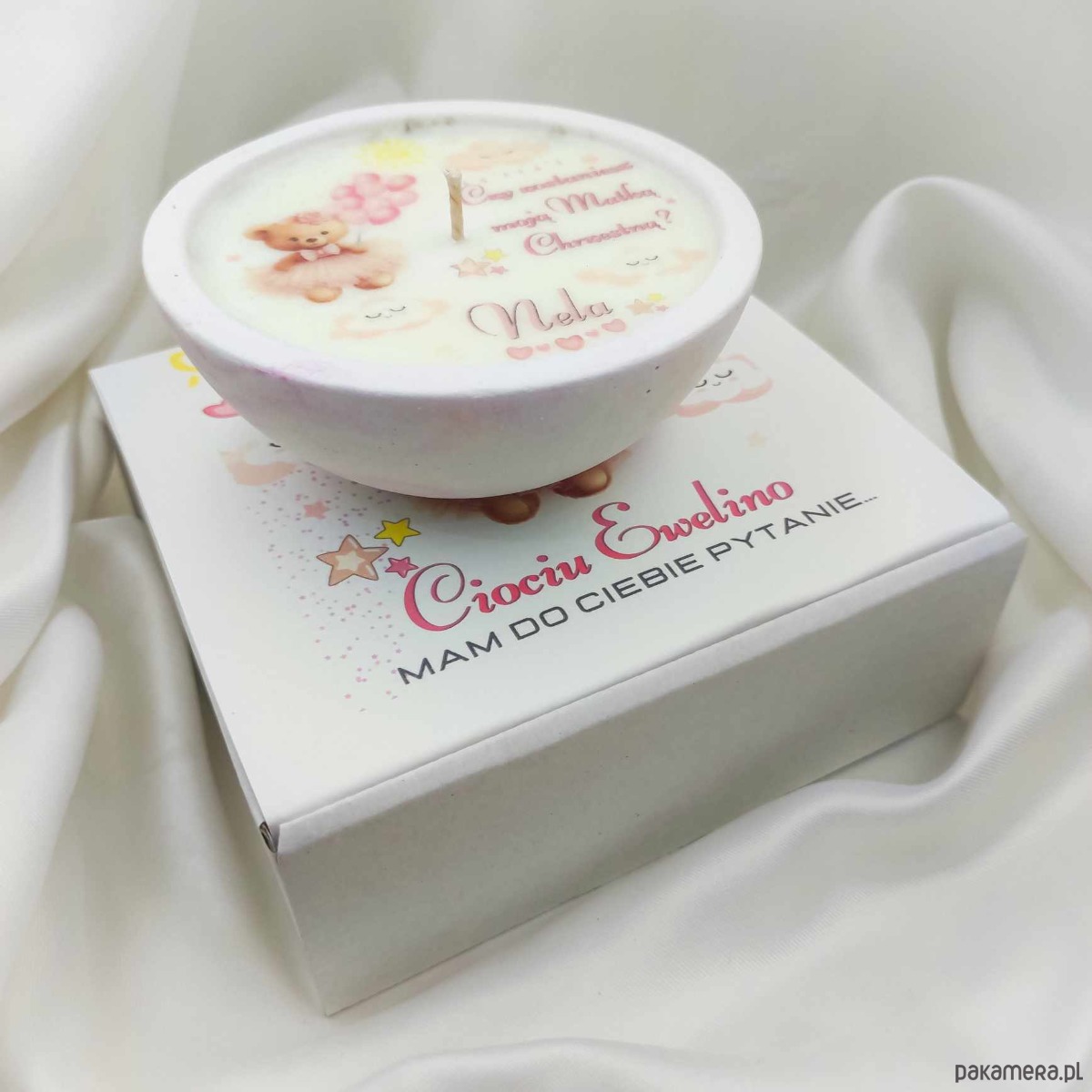 Doskonałym pomysłem jest personalizowana świeca z pytaniem "Czy zostaniesz moją Matką Chrzestną?"