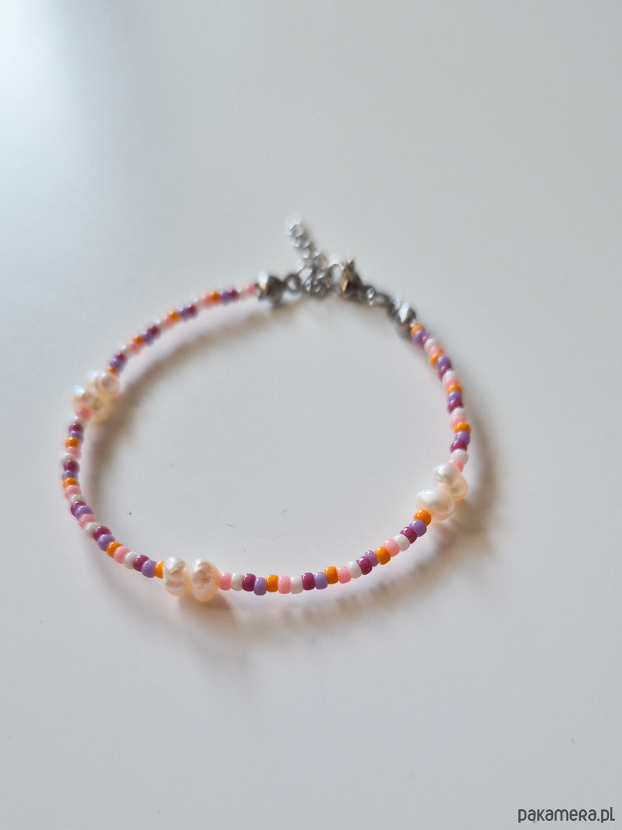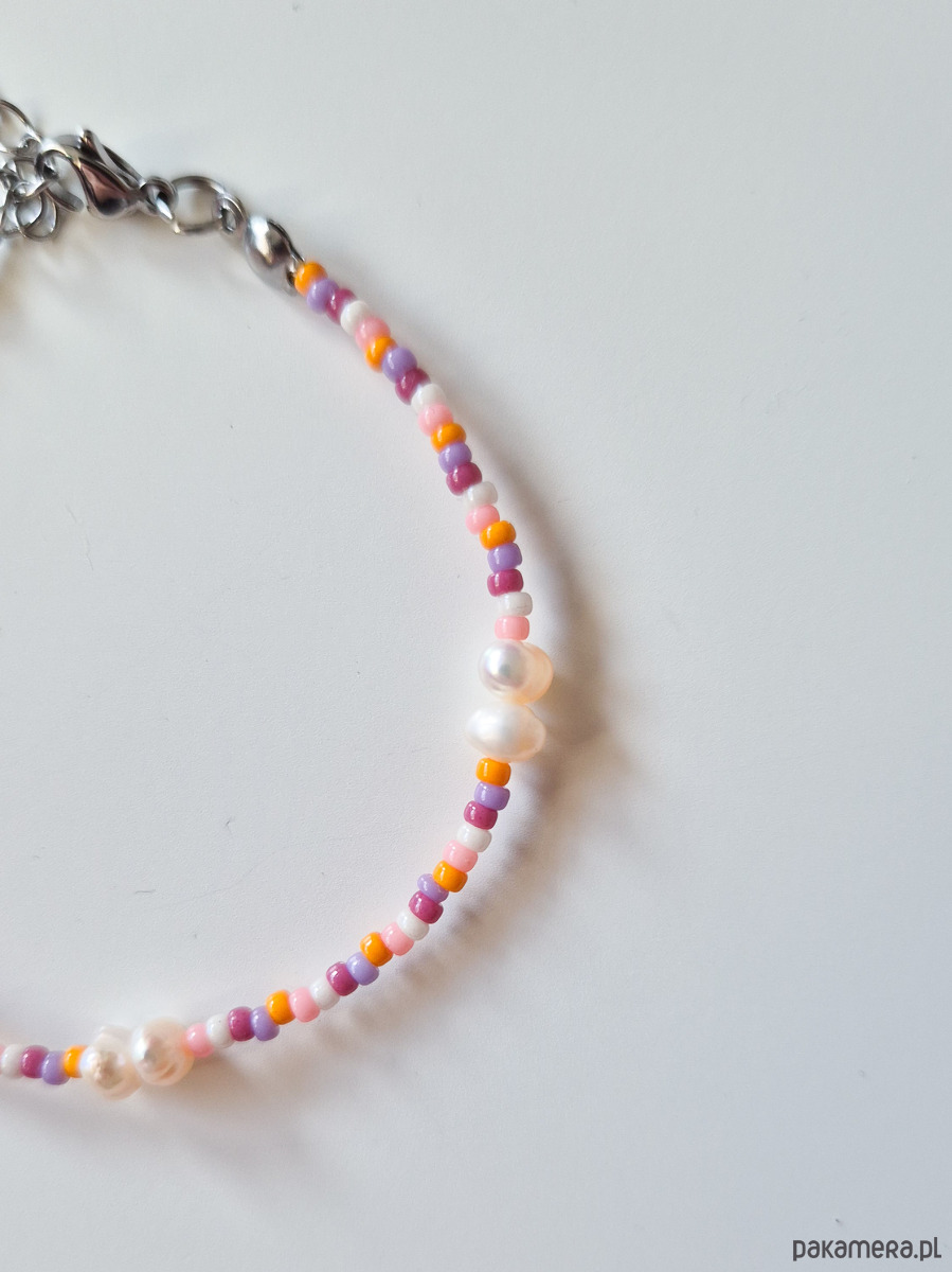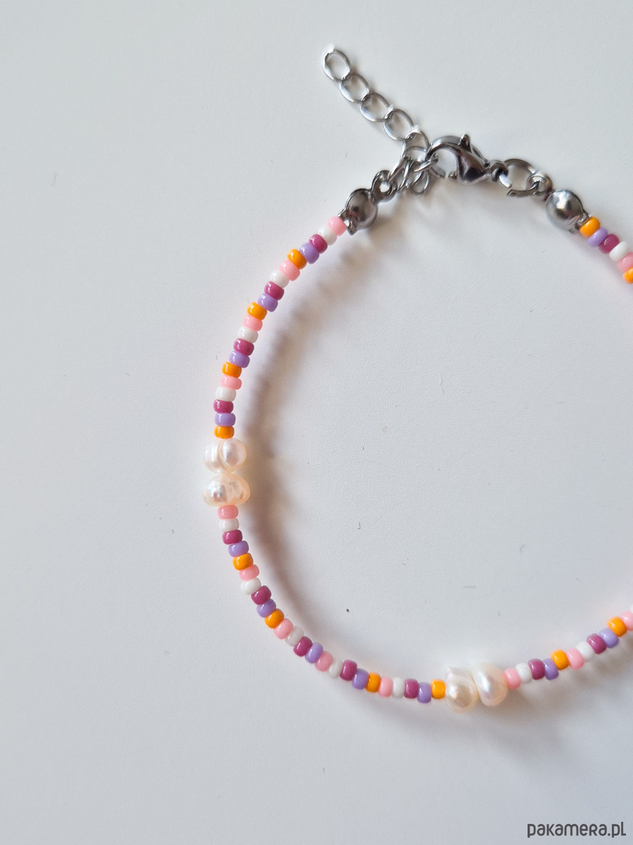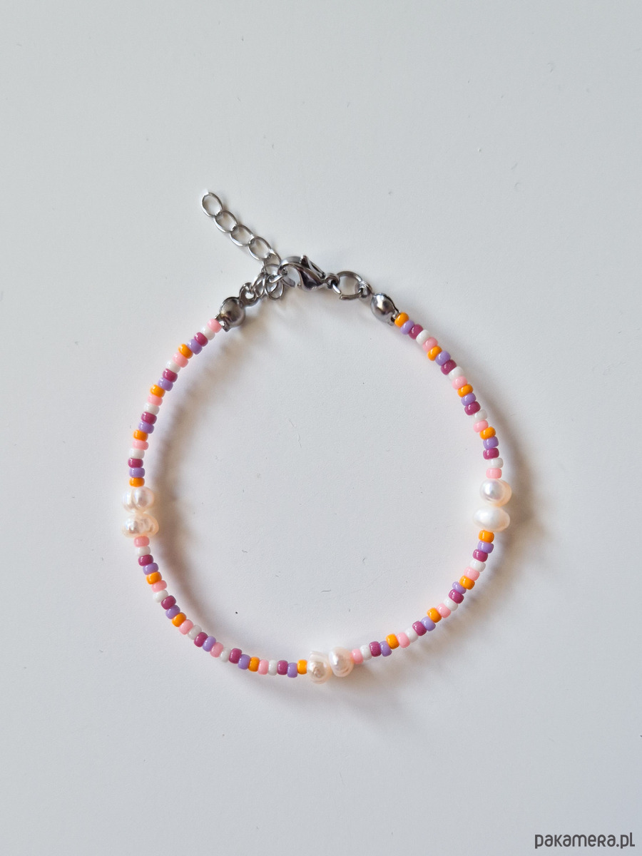 Kolorowa delikatna bransoletka, wykonana z wysokiej jakości szklanych koralików oraz pereł.