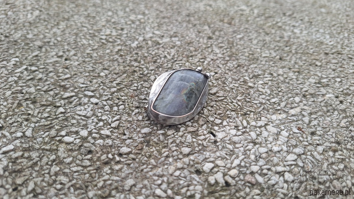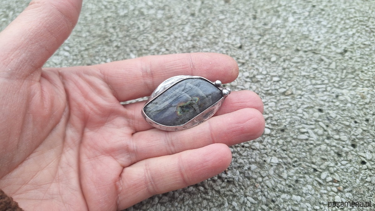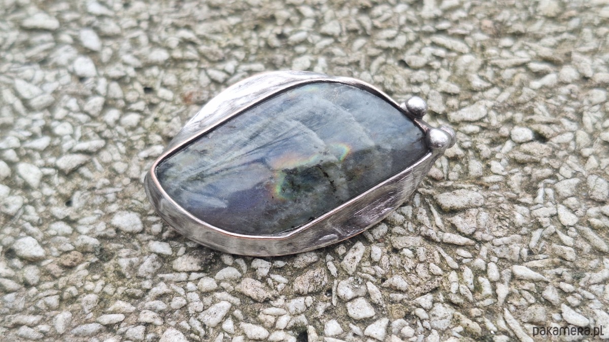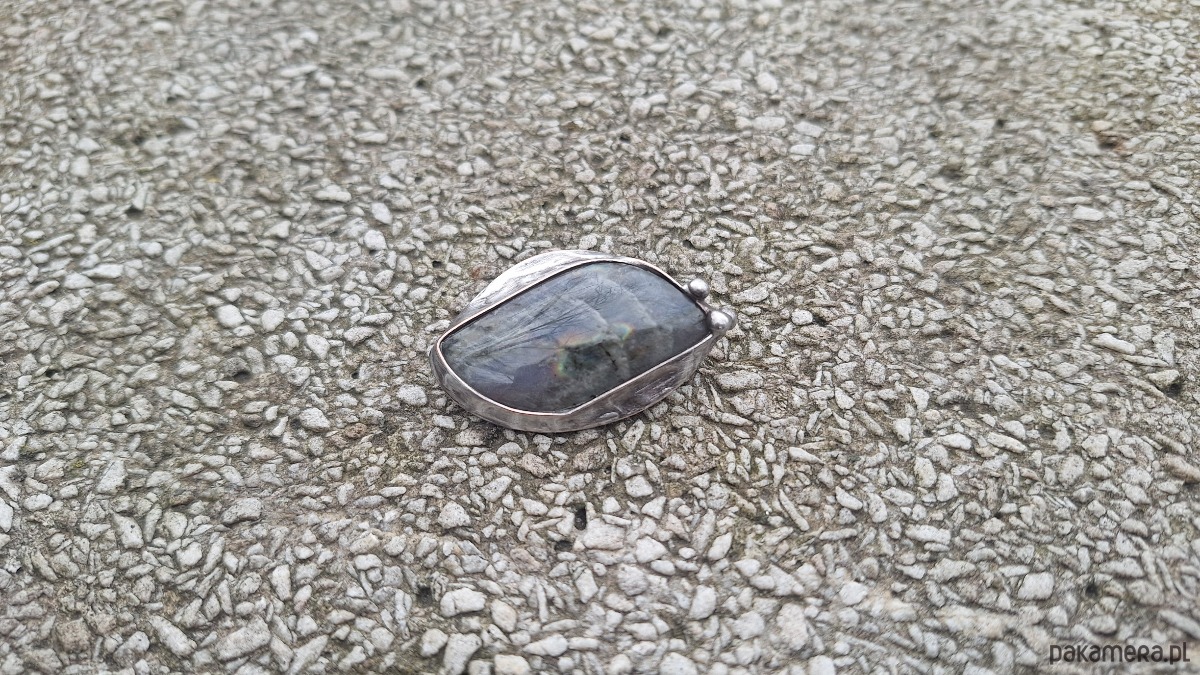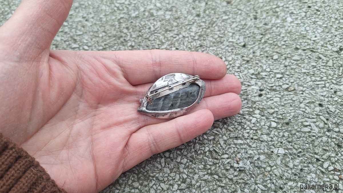 Broszka wykonana z miedzi, cyny i labradorytu. Wymiary ok. 4 na 2.5 cm. Zapięcie metalowe.