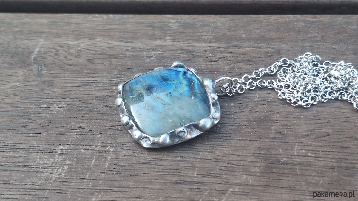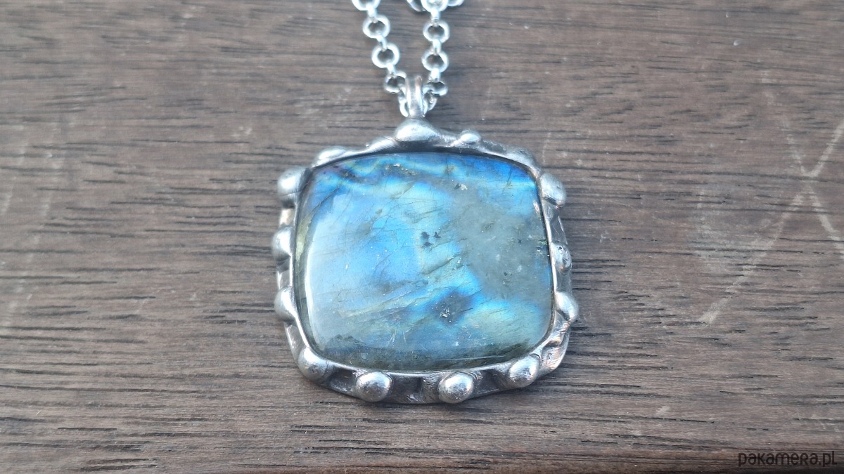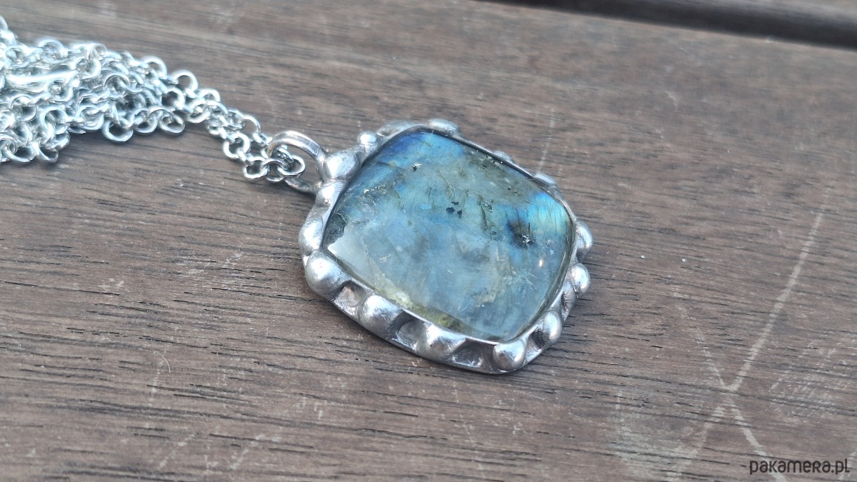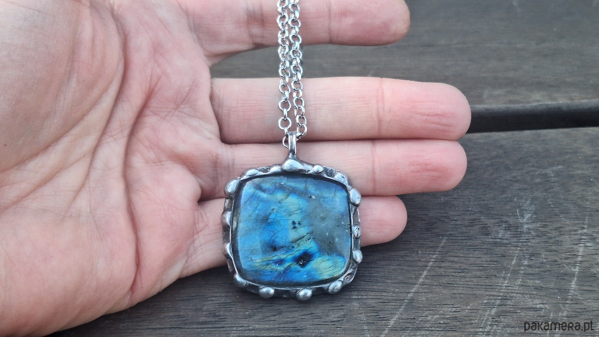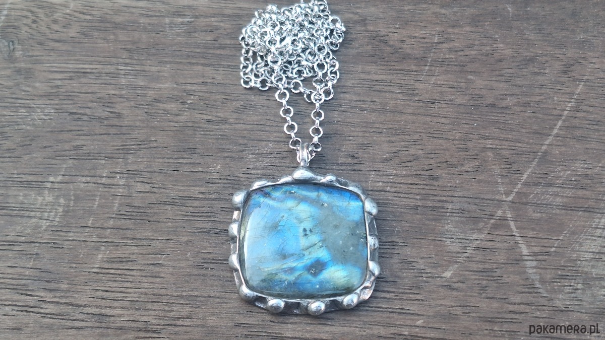 Wisiorek wykonany z miedzi, cyny i labradorytu. Wymiary ok. 3 na 3.5 cm. Zawieszony na łańcuszku o długości ok. 50 cm.