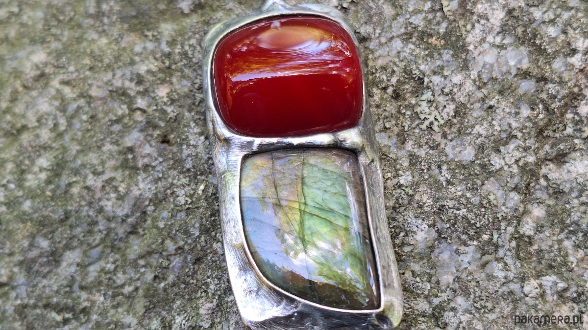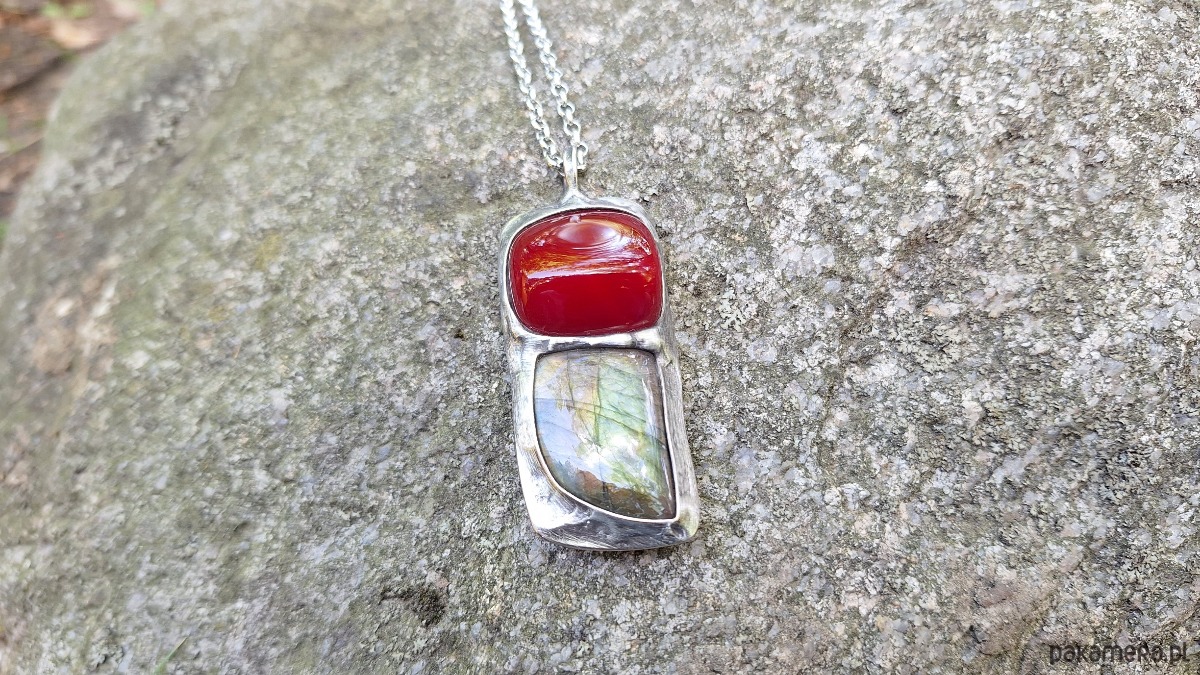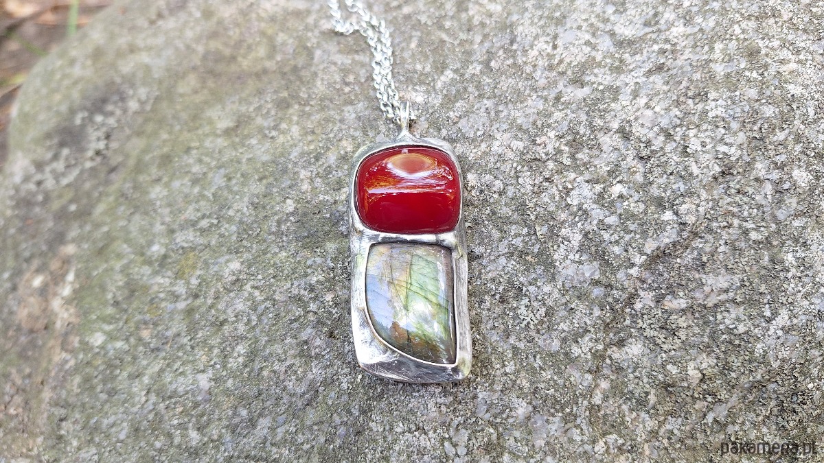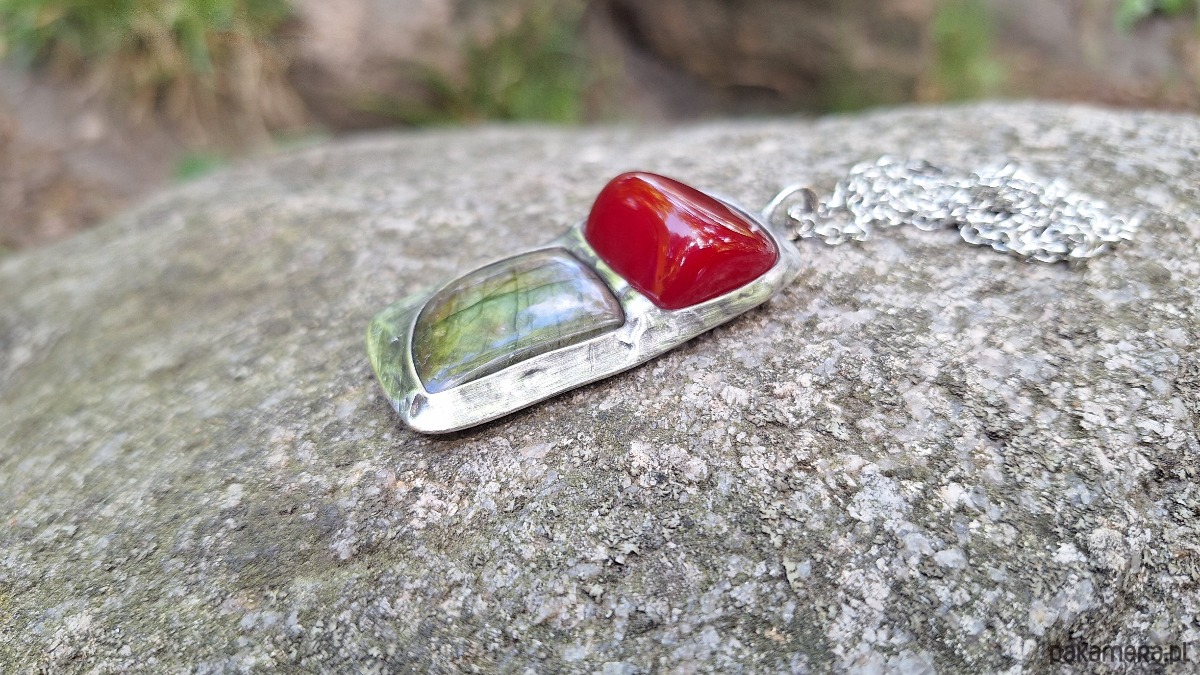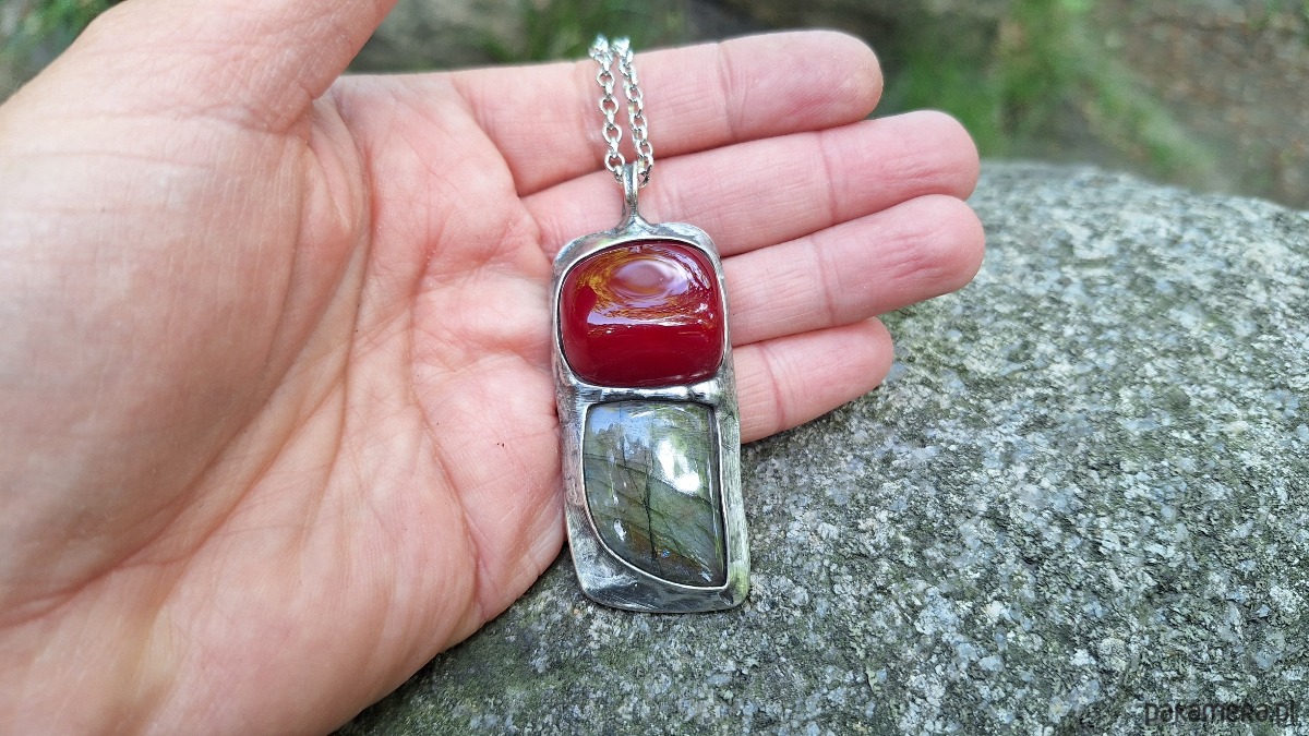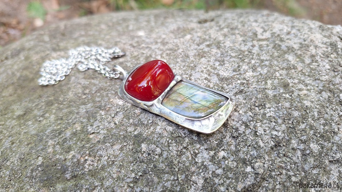 Wisiorek wykonany z miedzi, cyny, agatu i labradorytu. Wymiary ok. 5.5 na 2.5 cm. Zawieszony na łańcuszku o długości ok. 50 cm.