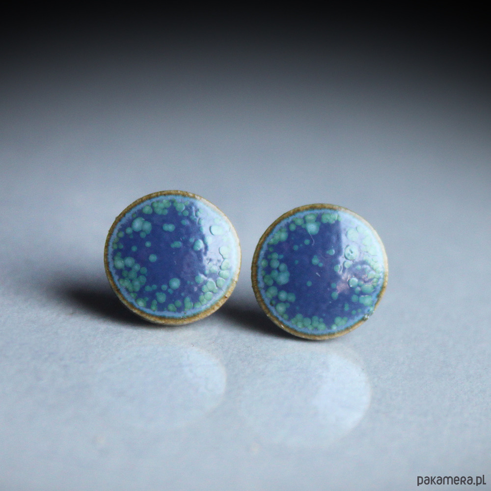 Ceramiczne kolczyki w formie sztyftów, ręcznie wykonane z delikatnej gliny kamionkowej, jednostronnie szkliwione mieszanką szkliw w kolorze błękitu i zieleni , z efektem plamek, na antyalergicznych sztyftach w kolorze srebrnym. średnica ok. 11mm.Polecam
