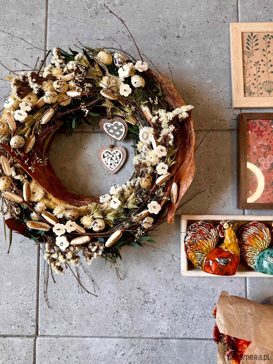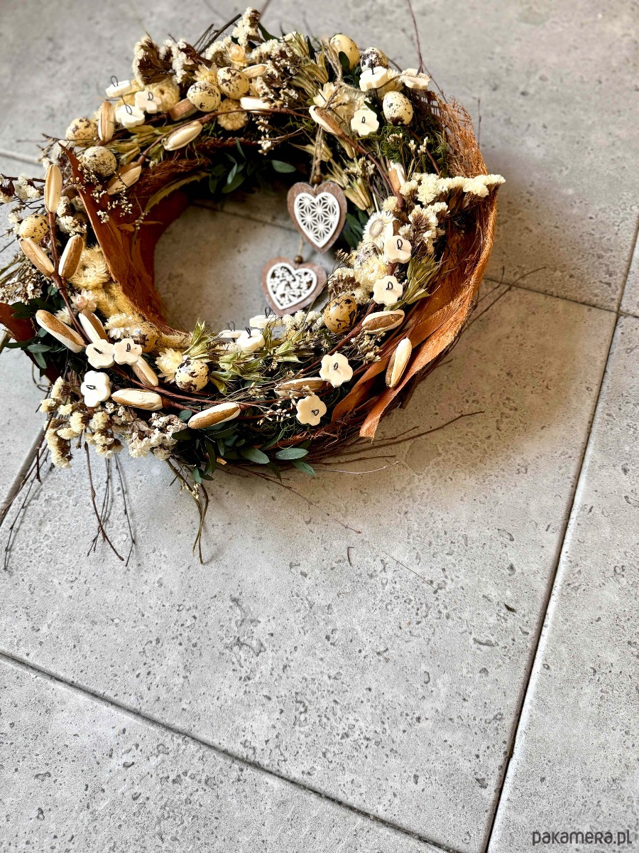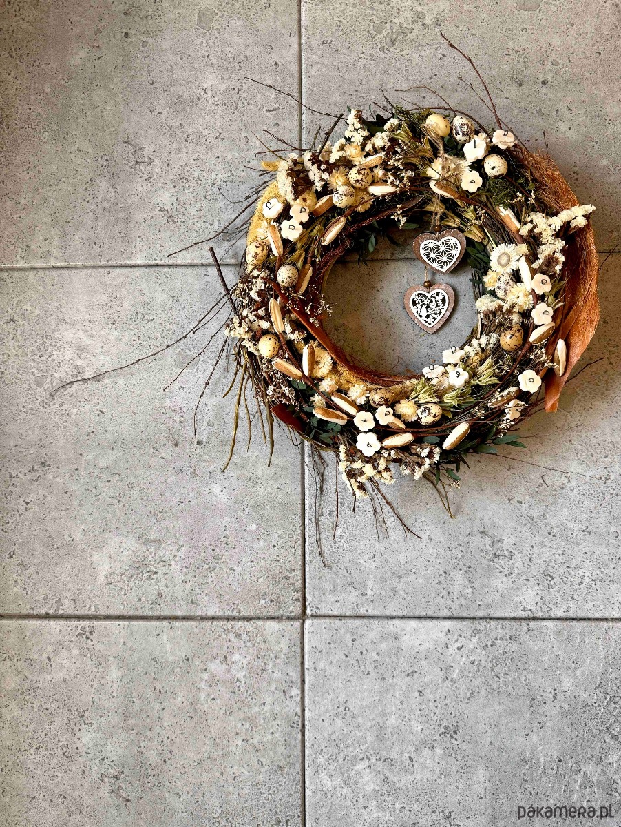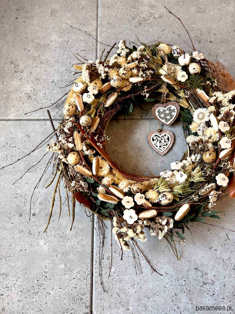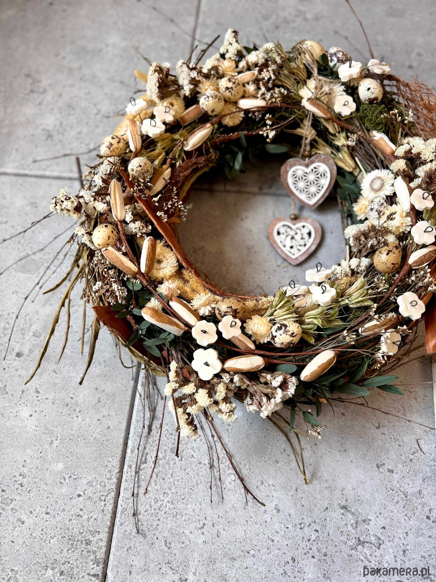 M.in.: Kocanki, stabilizowany Eukaliptus, Brzoza, kora kokosowa, Limonium (stabilizowane), plastikowe jajeczka i drewniane serducha.