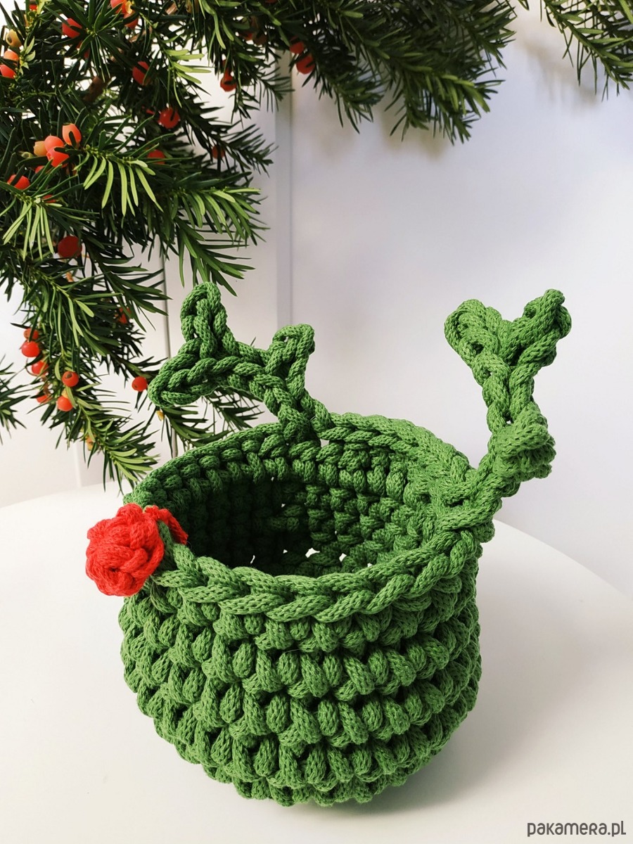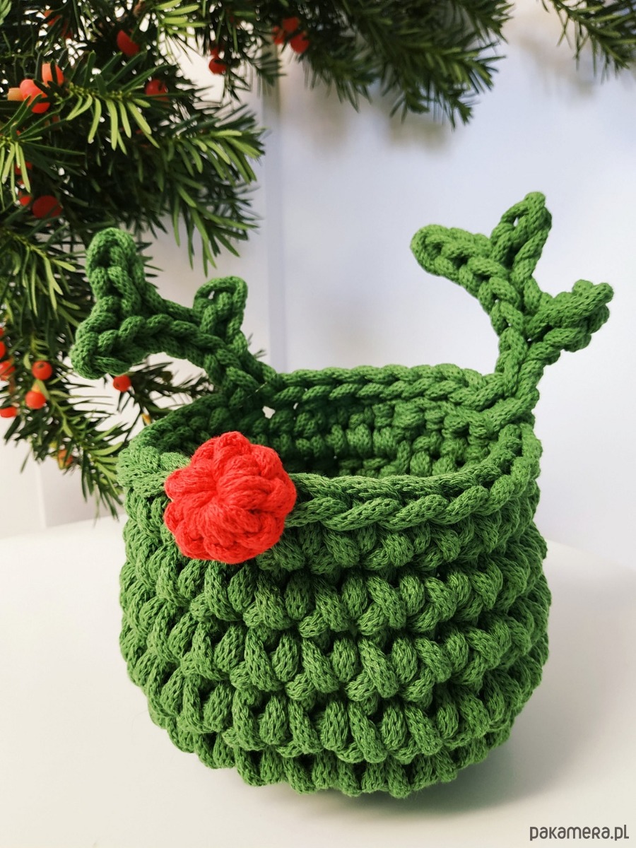 Prześliczny koszyczek leśny Renifer Rudolf wykonany jest ze sznurka bawełnianego na szydełku.