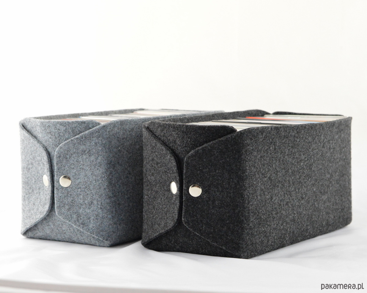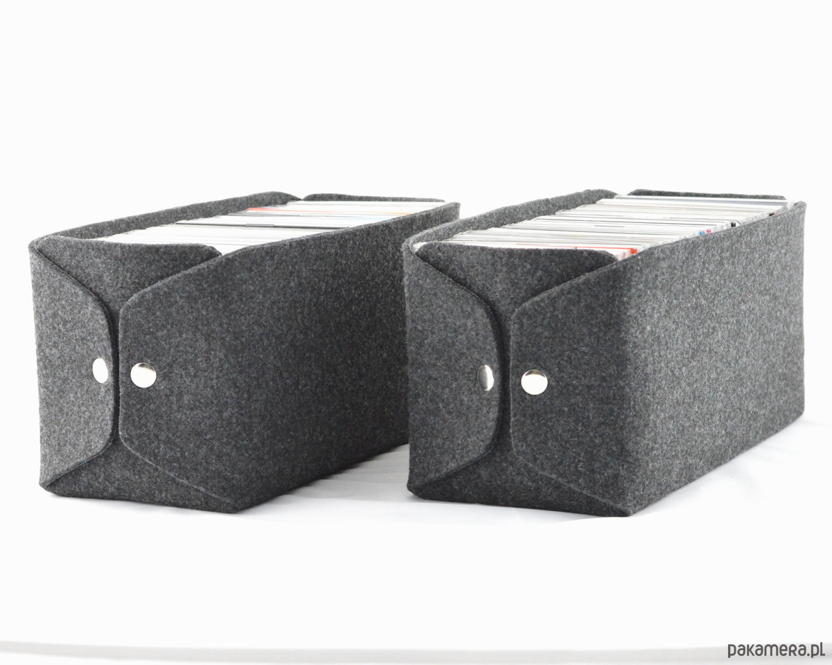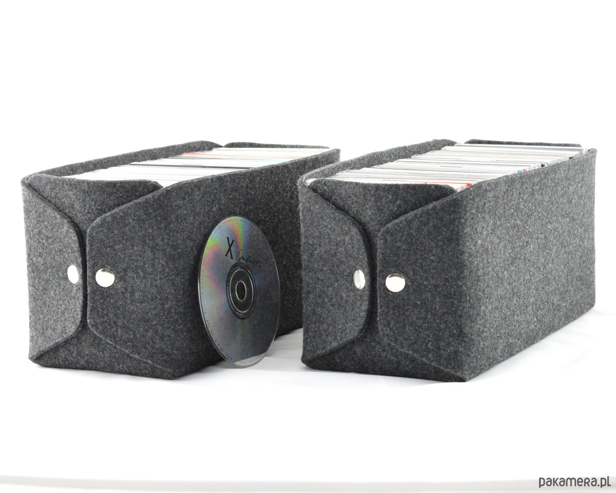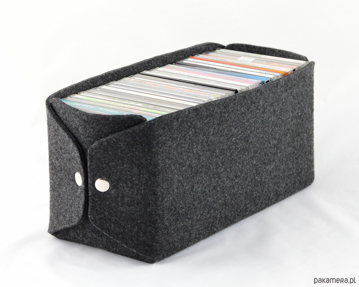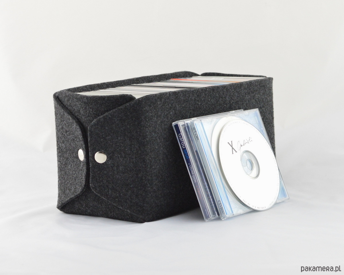 Pudełko zostało wykonane z grubego, mocnego filcu. Jest naprawdę bardzo urocze i solidne! Zostało zaprojektowane tak, aby idealnie pasowało na płyty CD. Płyty ustawione są grzbietami do góry, czyli widzisz etykiety płyt. W 1 pudełku mieści się około 30 płyt - uzależnione od grubości opakowań.
