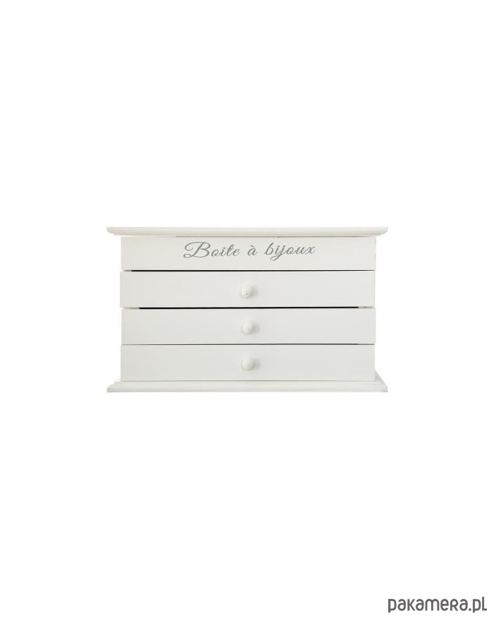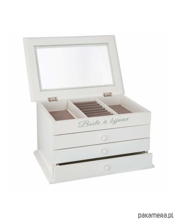 Piękna szkatułka na biżuterię z 3 szufladkami. Pojemna kasetka w kolorze białym wykonana jest z MDF. W górnej części jest przeszklona pokrywa, dzięki czemu zawartość jest widoczna. Górna część podzielona jest na 3 przegródki.