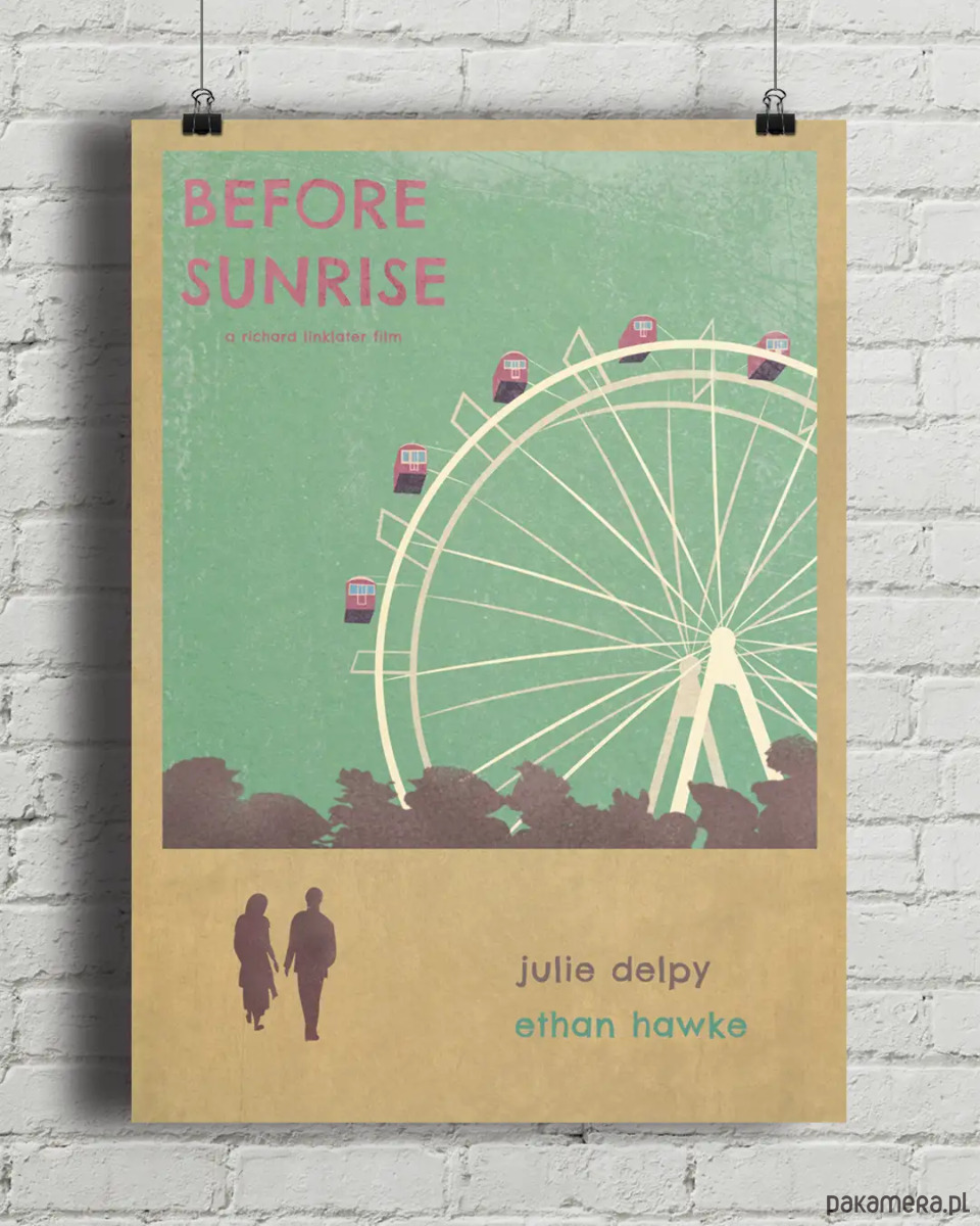 Plakat inspirowany filmem "Przed wschodem słońca" ("Before Sunrise") w reżyserii Richarda Linklatera. Klasyka niebanalnego romansu. Plakat utrzymany jest w ciepłych barwach i stanowić będzie świetną dekorację domu lub prezent dla miłośników kina.