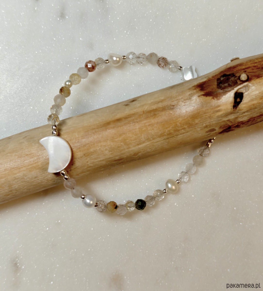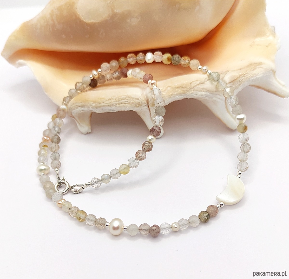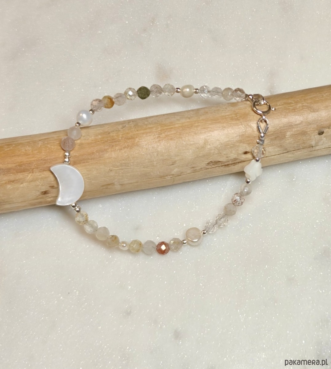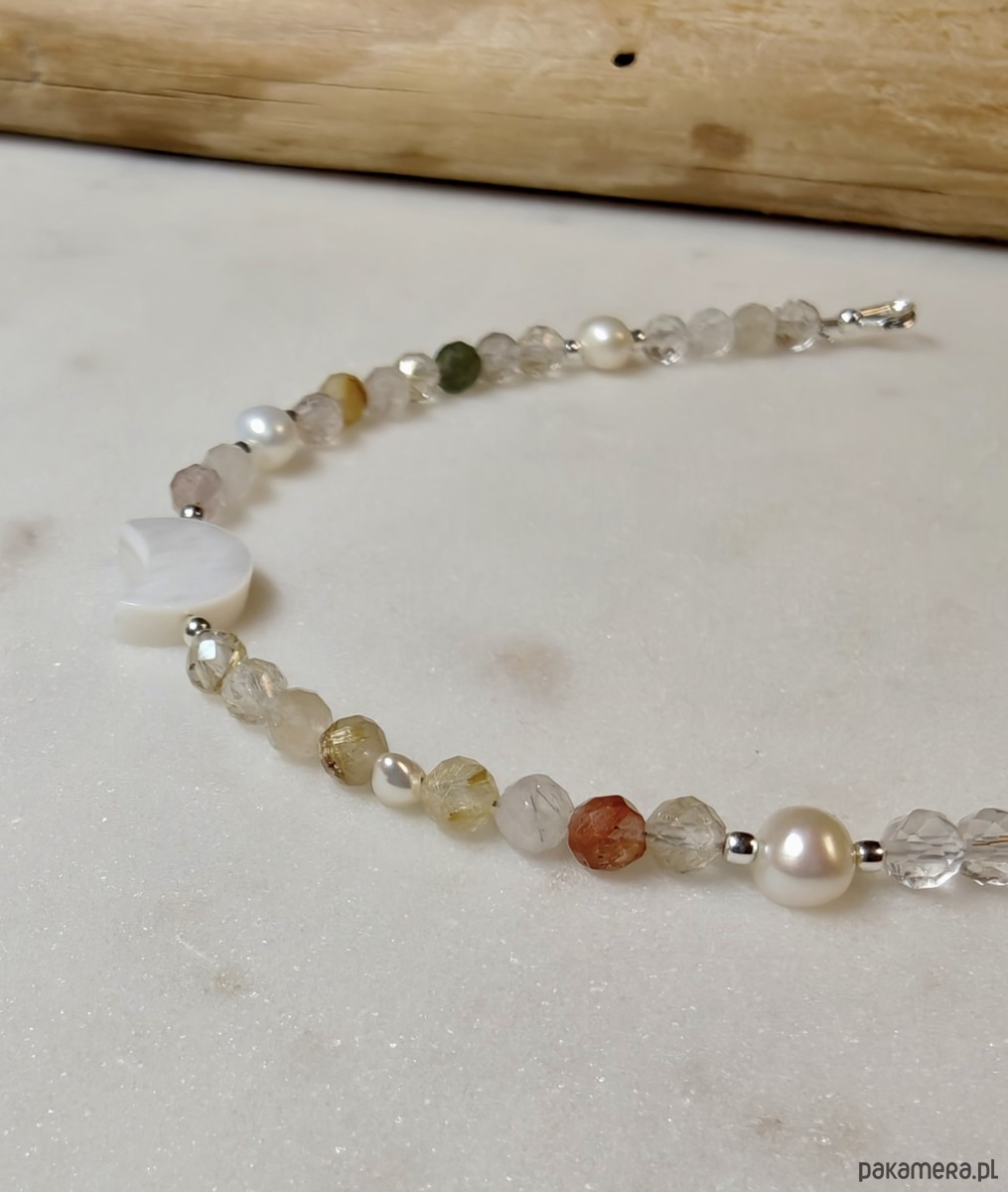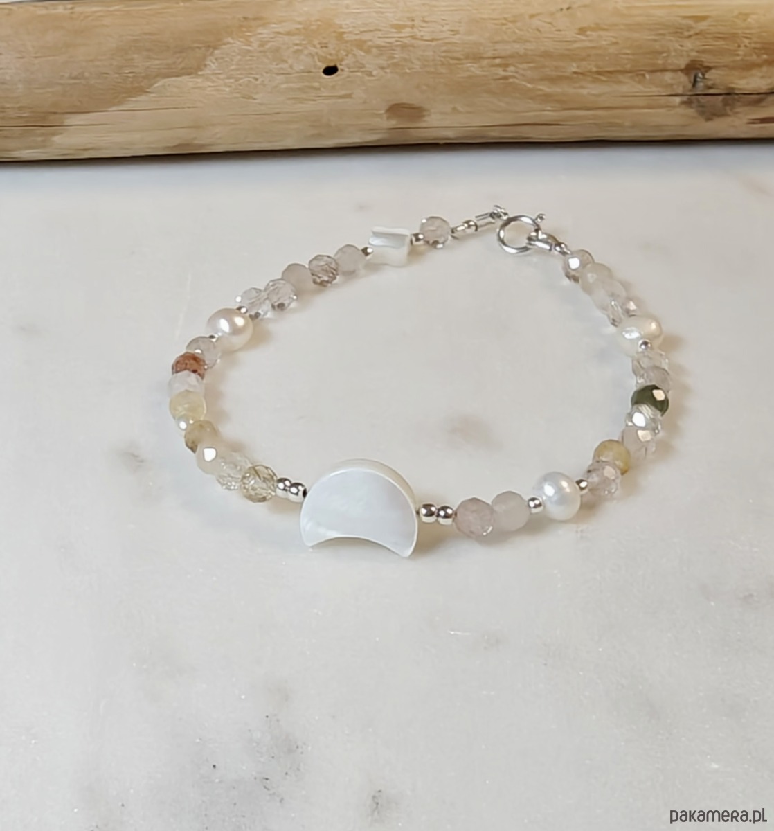 Bransoletka w delikatnej tonacji ładnie zgrywającej się z kolorem skóry. Wykonans z kamieni kwarcu z dodatkiem rutylu, perełek i srebrnych kuleczek. Z jednej strony znajduje się księżyc, ozdoba z masy perłowej. Urok tej biżuterii polega na zróżnicowanym połysku odmiennych faktur użytych elementów i ich spójności kolorystycznej.