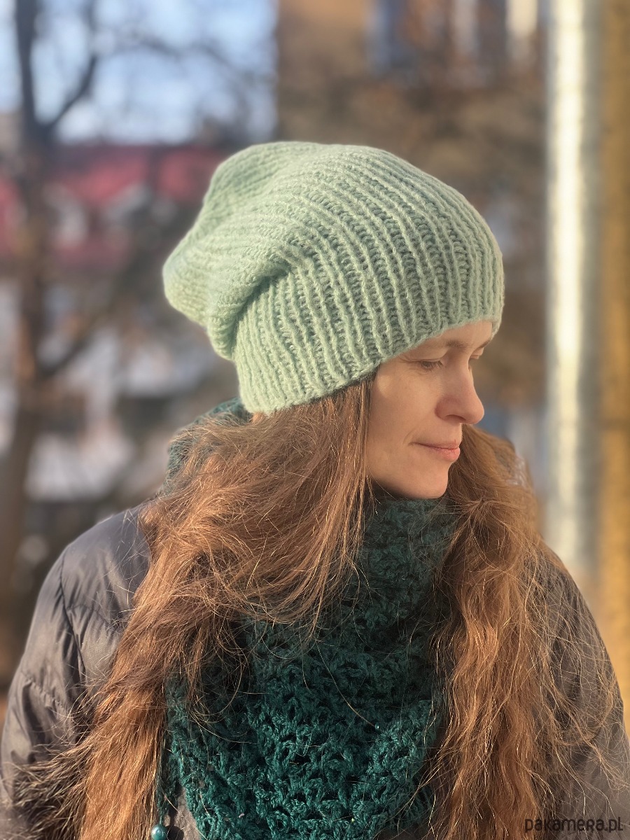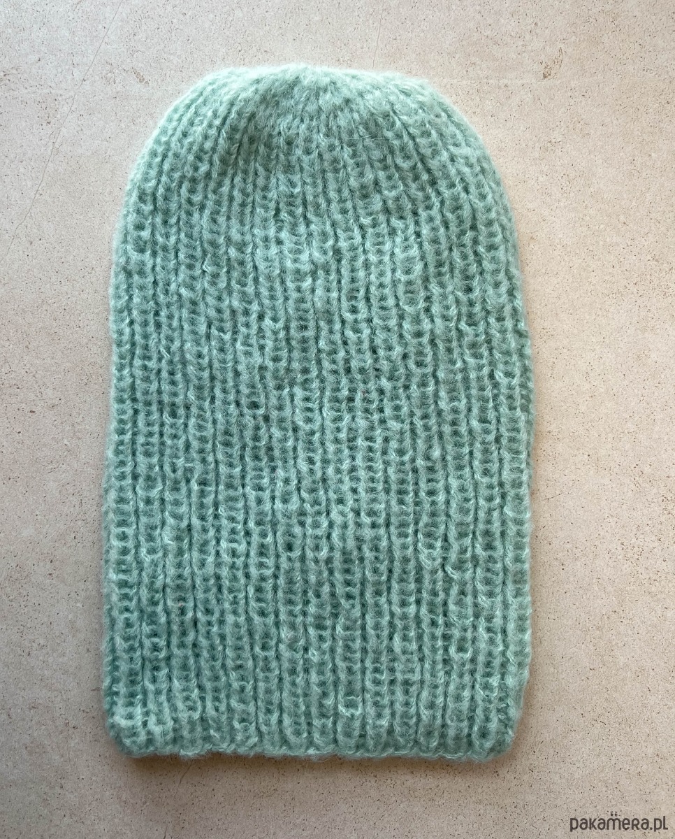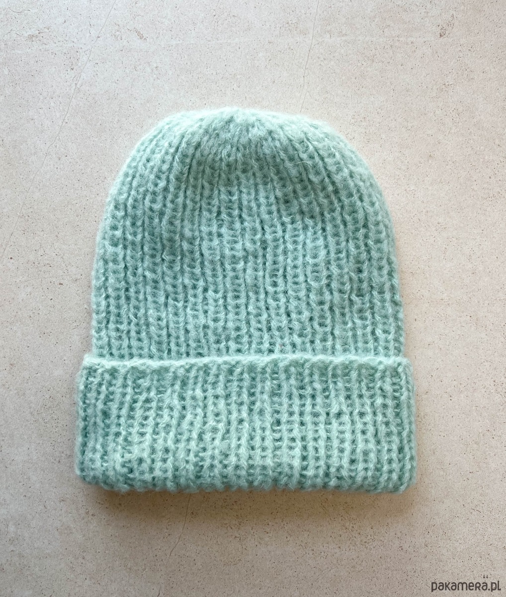 Czapka jest oversize, jest rozciągliwa, można ją dowolnie wywijać. Jest delikatna w dotyku, puszysta, miękka i przewiewna.