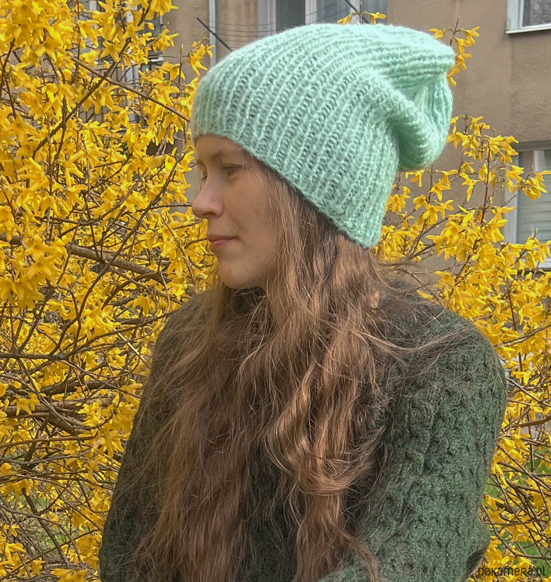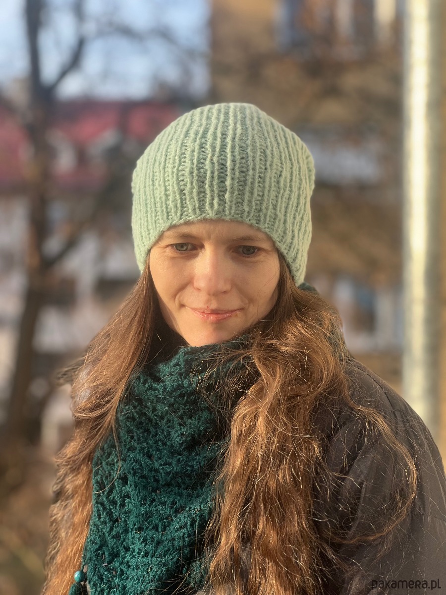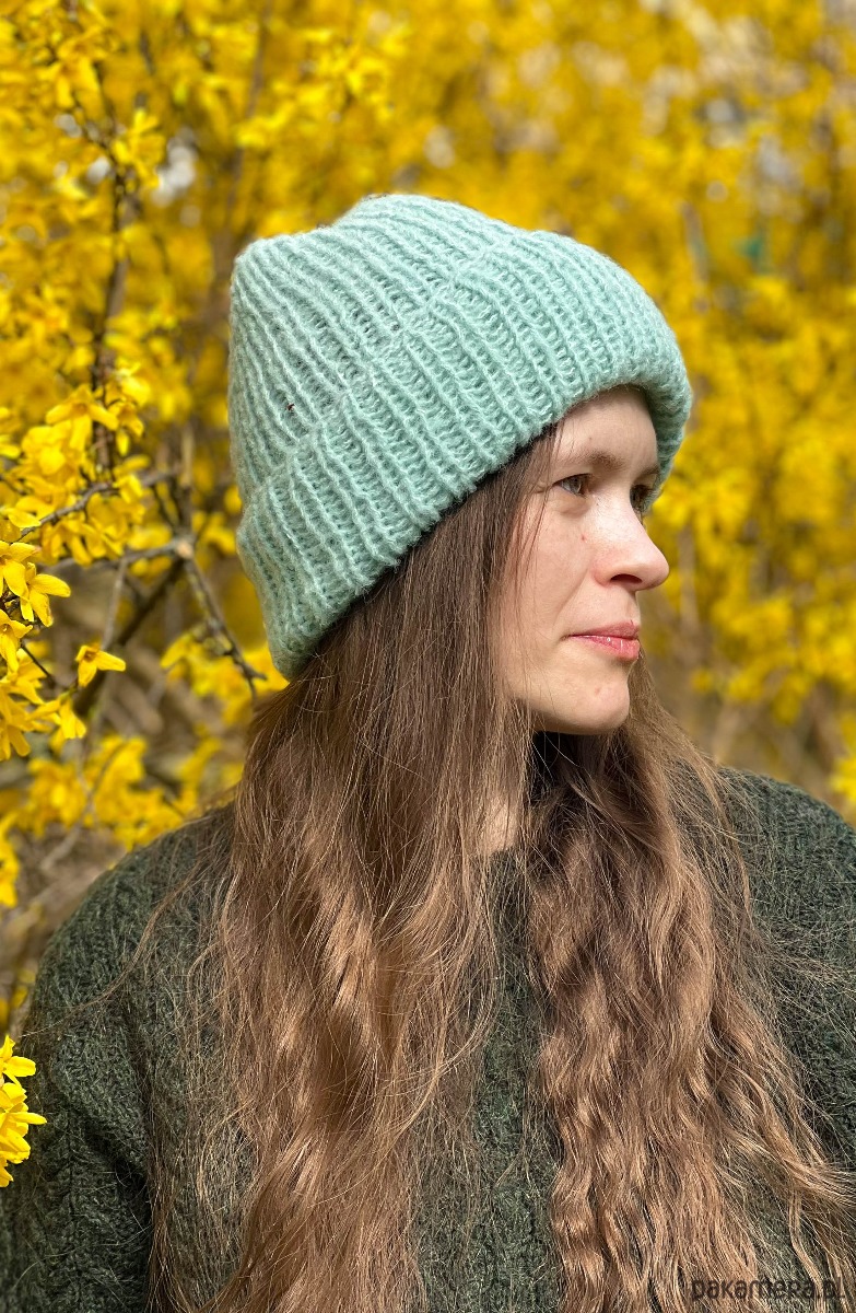 Czapka jest oversize, jest rozciągliwa, można ją dowolnie wywijać. Jest delikatna w dotyku, puszysta, miękka i przewiewna.
