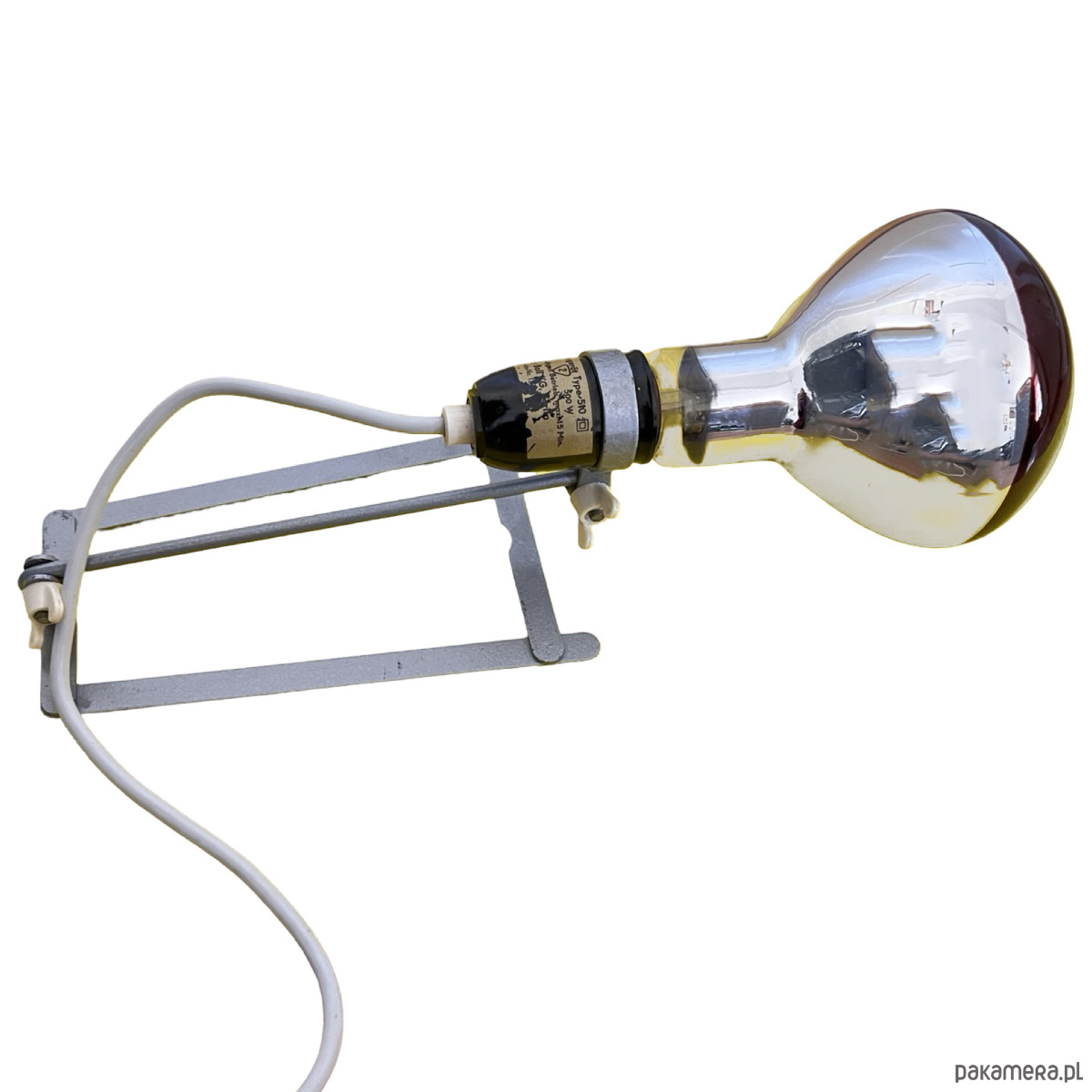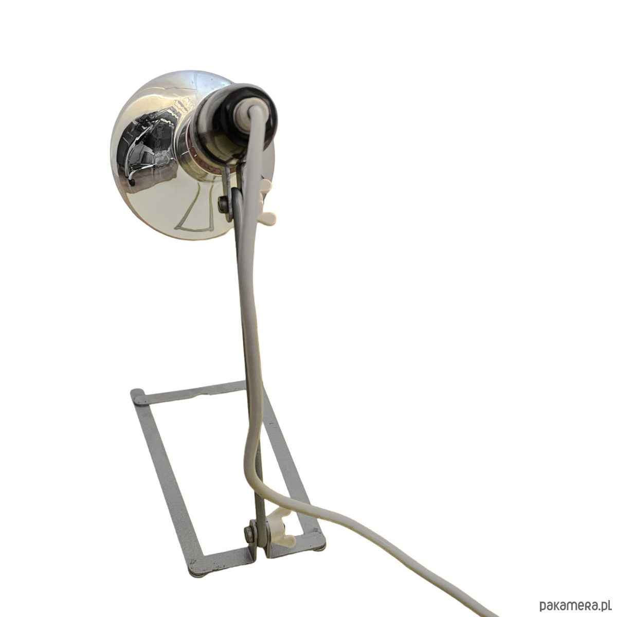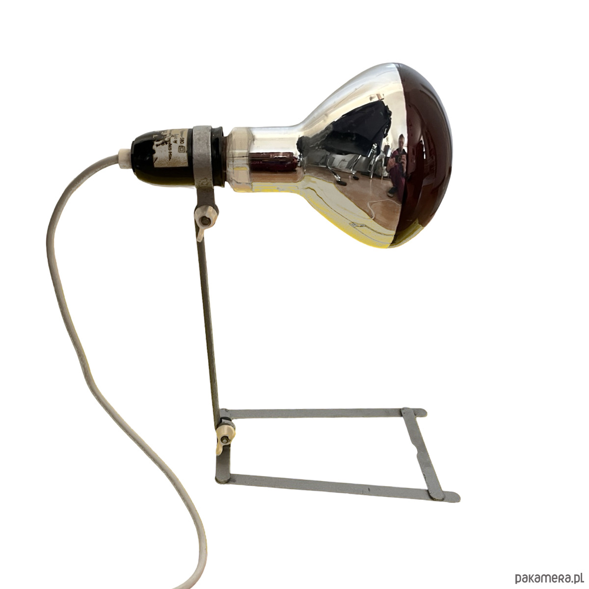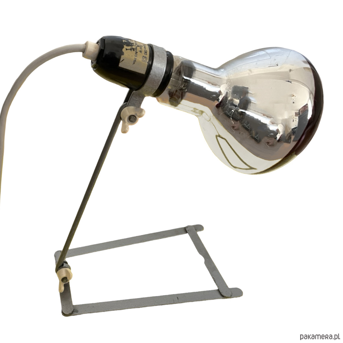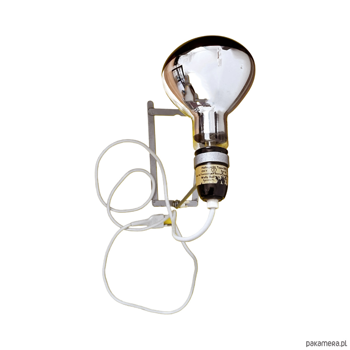Lampa stołowa w stylu industrialnym wyprodukowany w Niemczech w latach 60. XX wieku dla Wally Ball Leuchten. Lampa o minimalistyczej formie zrobiona z aluminiowego drutu z bakelitowym wykończeniem. bez klosza, w zestawie z żarówką grzewczą, ale można ją spokojnie zastąpić inną żarówką i używać jako lampkę nocną lub stołową. Lampa sprawna na pojedynczą żarówkę E27 do 500W. Lampa, dzięki dużej mocy może być stosowana również jako lampa lecznicza. Lampa sprzedawana z żarówką.