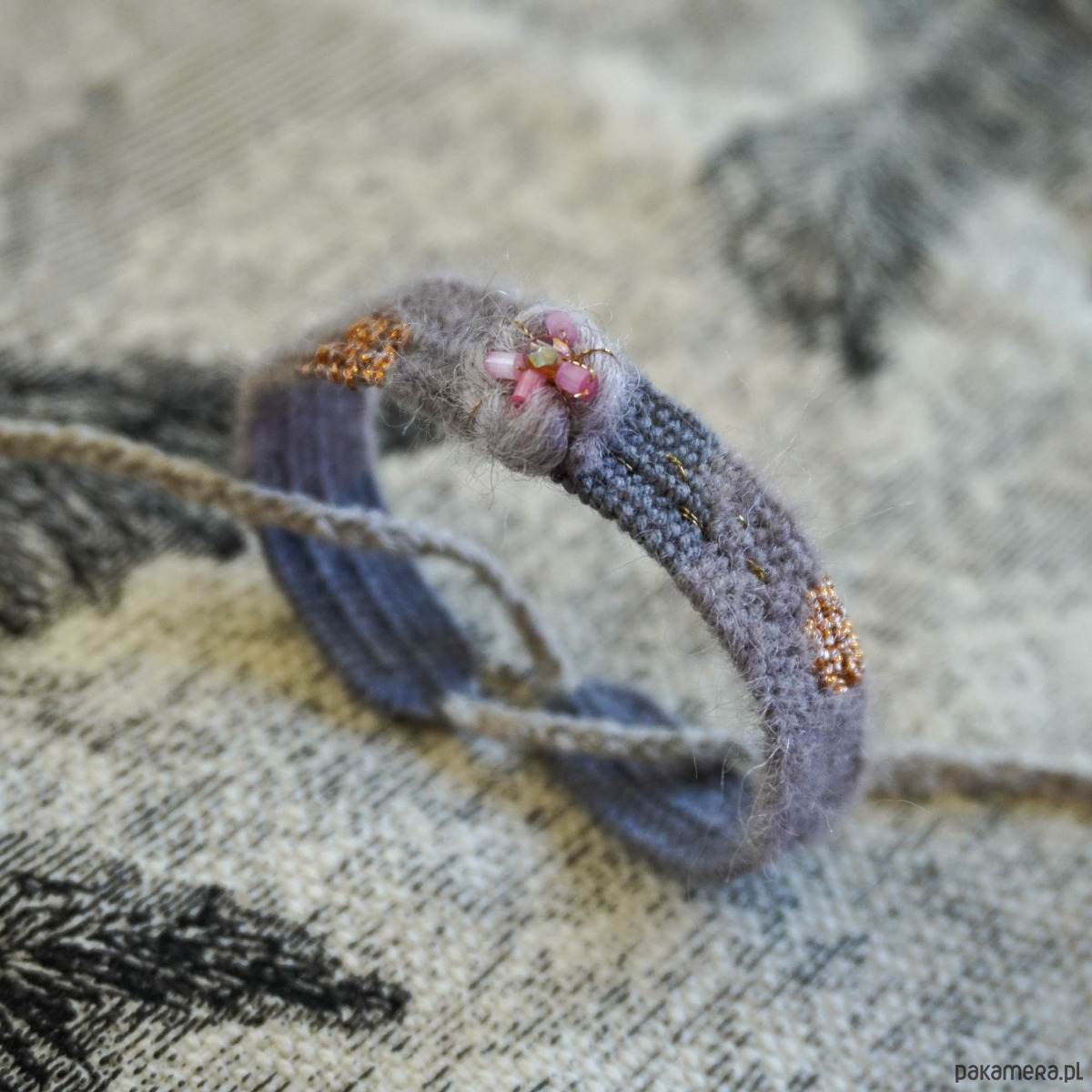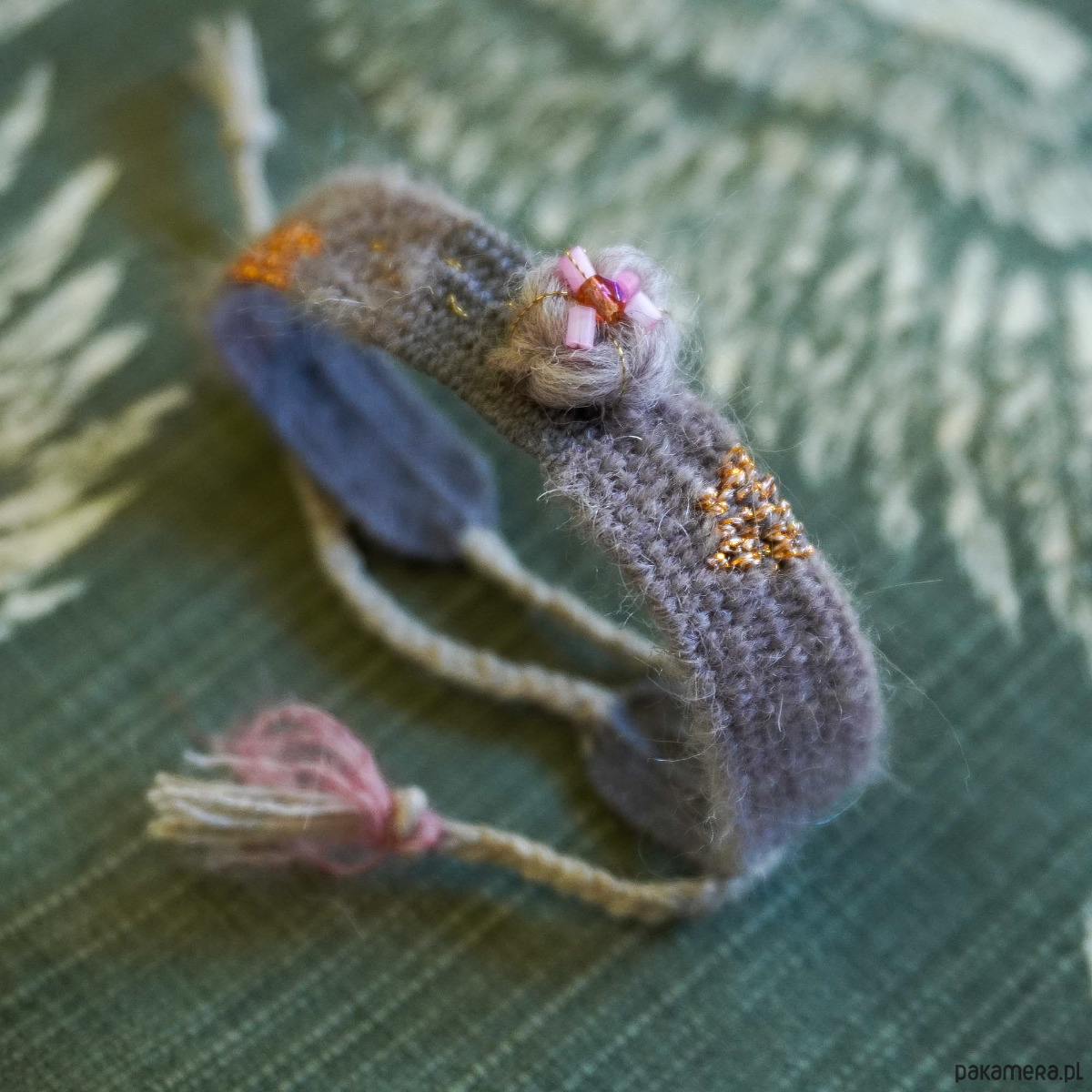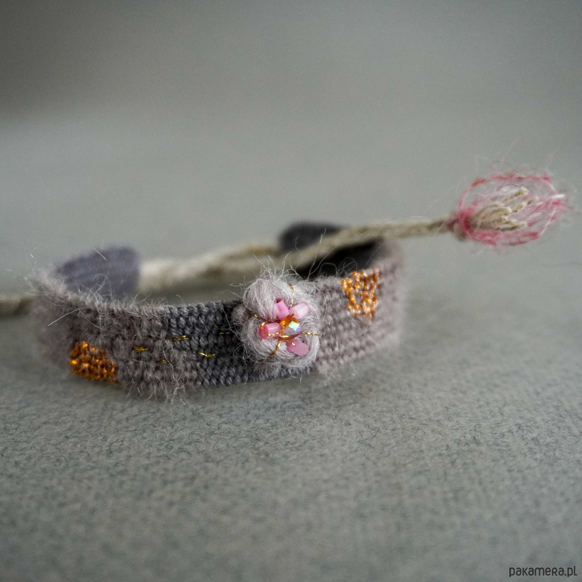 Absolutnie wyjątkowa bransoletka ręcznie wykonana na krośnie. Stonowana kolorystyka, surowość naturalnych nici czyli bawełny, lnu, wełny i jedwabiu została pięknie zbalansowana złotym błyskiem, dekoracyjnym wypukłym kwiatuszkiem/kłębuszkiem z koralikami szklanymi. Szerokość części tkanej to niecałe 1,5 cm, długość części tkanej to około 14, 15 cm. Bransoletkę wiąże się samodzielnie na supełek. Polecam gorąco♡. Bransoletki są estetycznie zapakowane, więc idealnie nadają się na prezent.