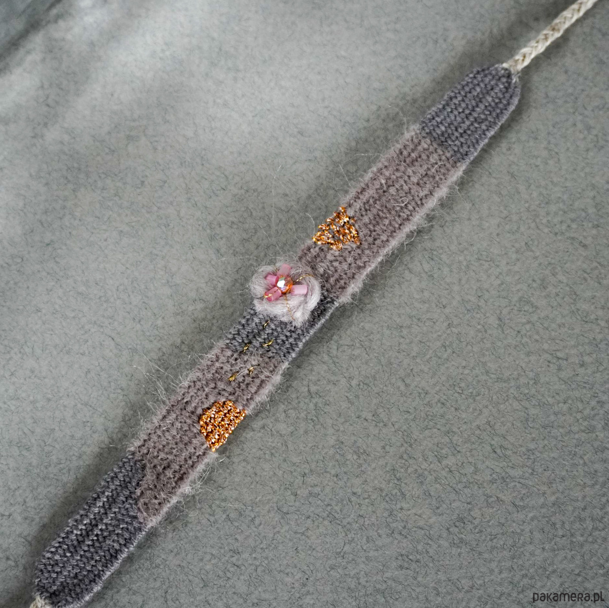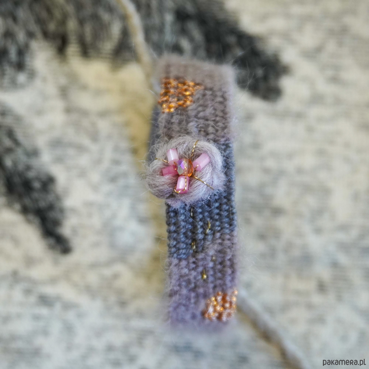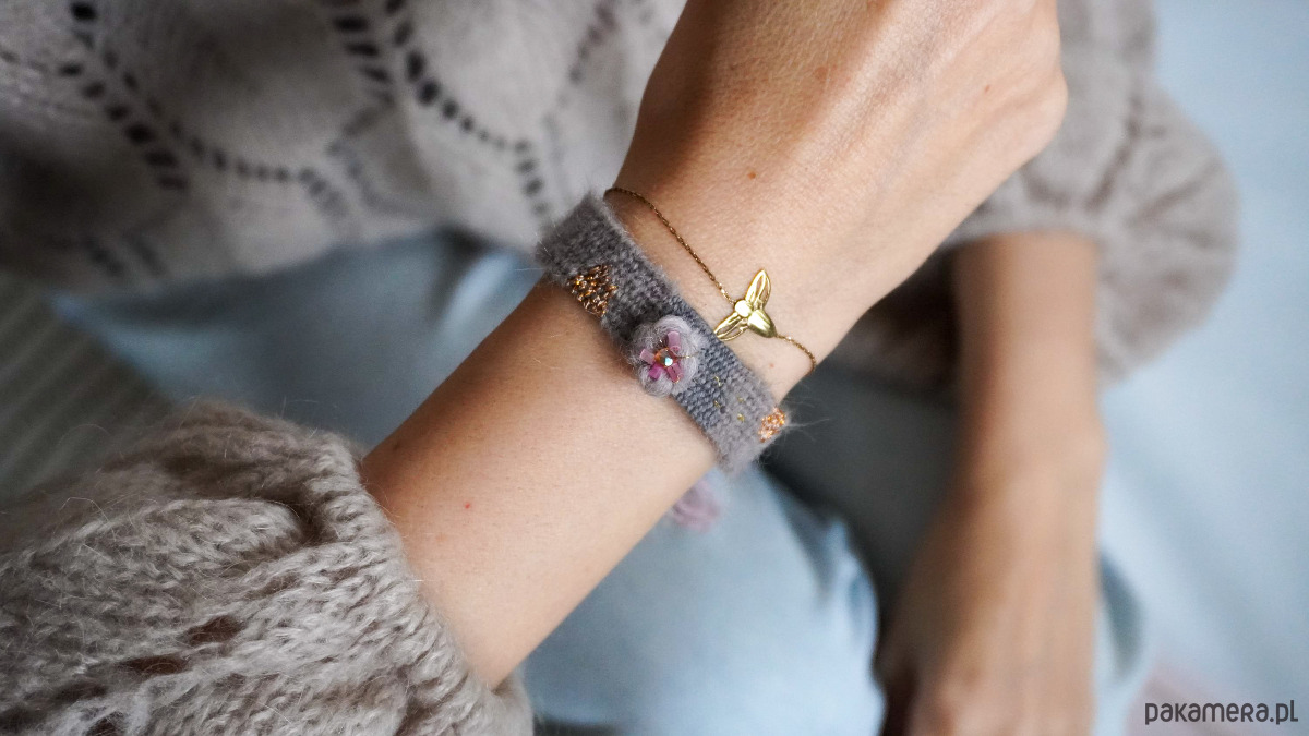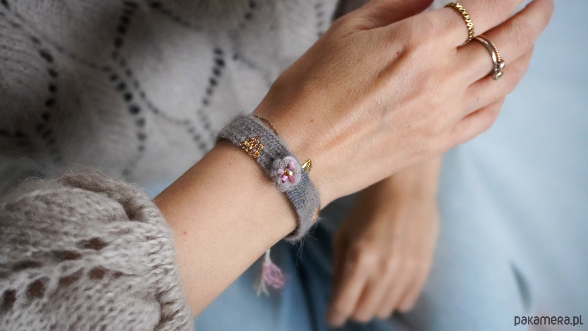 Absolutnie wyjątkowa bransoletka ręcznie wykonana na krośnie. Stonowana kolorystyka, surowość naturalnych nici czyli bawełny, lnu, wełny i jedwabiu została pięknie zbalansowana złotym błyskiem, dekoracyjnym wypukłym kwiatuszkiem/kłębuszkiem z koralikami szklanymi. Szerokość części tkanej to niecałe 1,5 cm, długość części tkanej to około 14, 15 cm. Bransoletkę wiąże się samodzielnie na supełek. Polecam gorąco♡. Bransoletki są estetycznie zapakowane, więc idealnie nadają się na prezent.