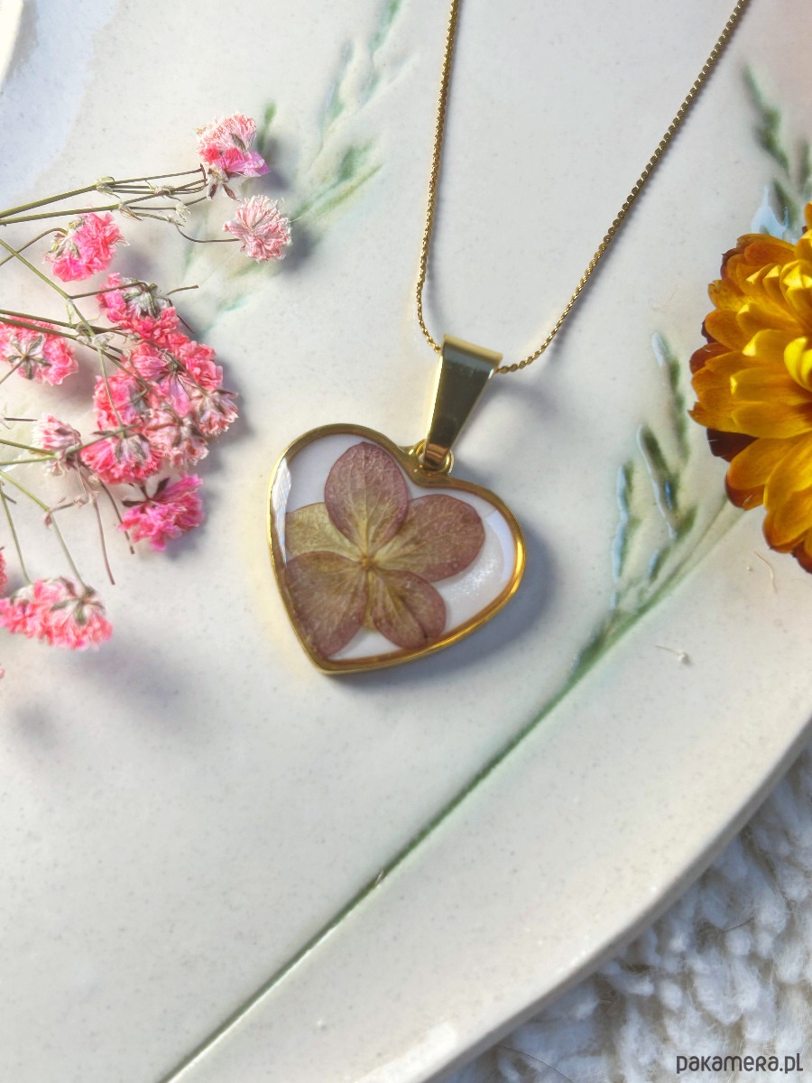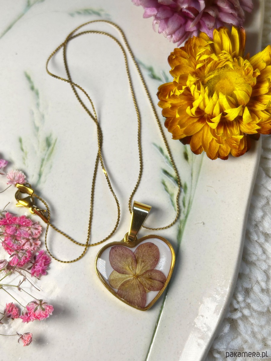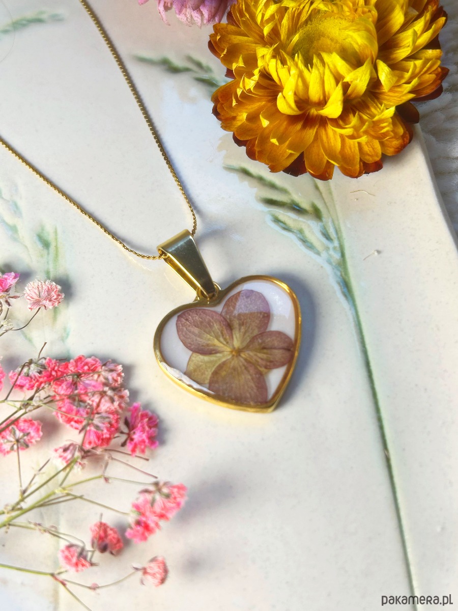 Przepiękny naszyjnik serce z hortensją - idealny prezent