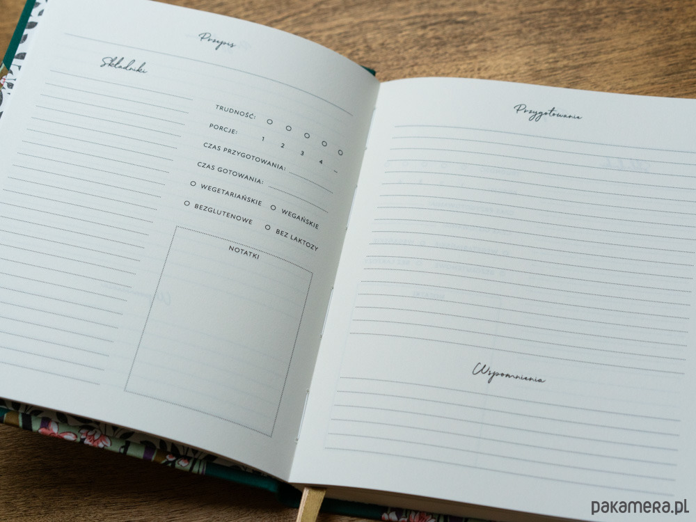 - na każdy przepis są przeznaczone 2 strony: znajdziesz miejsce na wypisanie składników, notatek, wklejenie zdjęcia lub wypisanie wspomnień