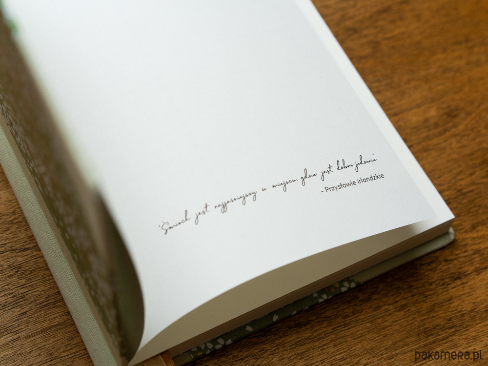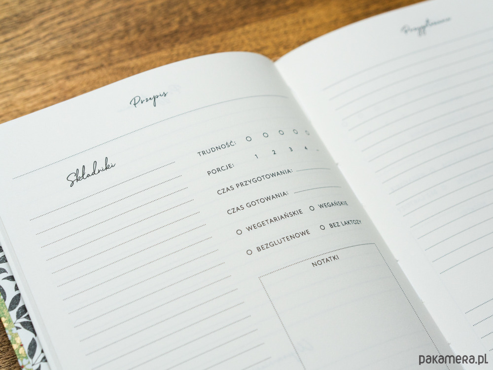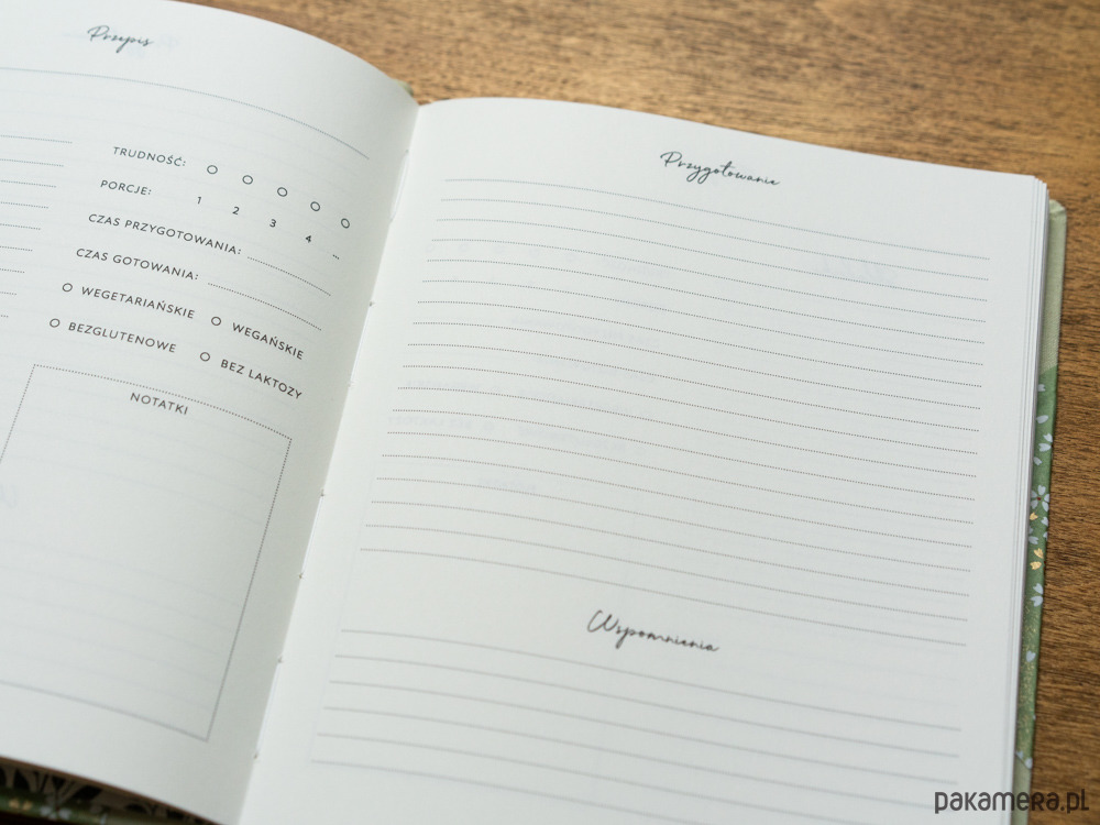 - na każdy przepis są przeznaczone 2 strony: znajdziesz miejsce na wypisanie składników, notatek, wklejenie zdjęcia lub wypisanie wspomnień