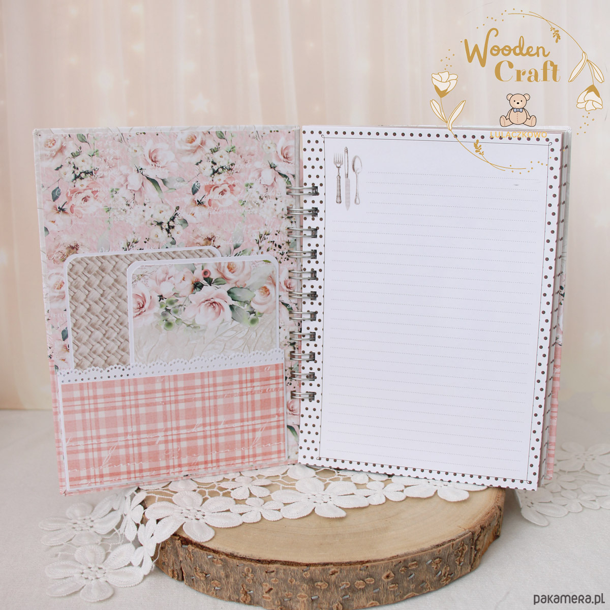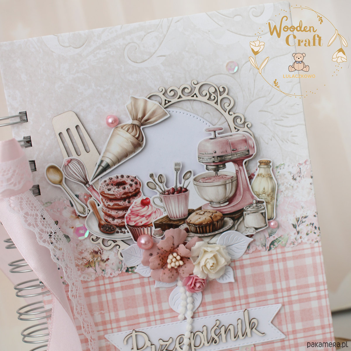 Piękny, ręcznie robiony przepiśnik, notes kulinarny wykonany metodą scrapbookingu z miksu kolekcji papierów. Okładka ozdobiona wycinankami z motywami miksera planetarnego, donutów, babeczek i kuchennych przyborów. Udekorowana ręcznie robionymi kwiatami oraz cekinami. Na przodzie tekturkowy napis "Przepiśnik" - do napisu mogę dodać również imię. Przepiśnik ozdobiony różowo-koronkową kokardą.