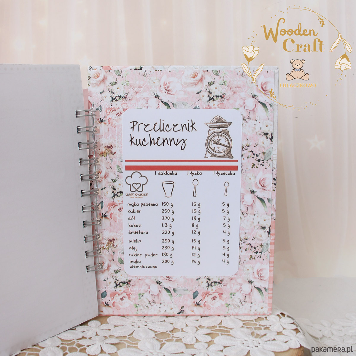 W środku znajduje się 80 kartek na przepisy, na przedniej okładce kieszonka oraz dwie maty na zapiski lub zdjęcia, na tylnej okładce przelicznik kuchenny.