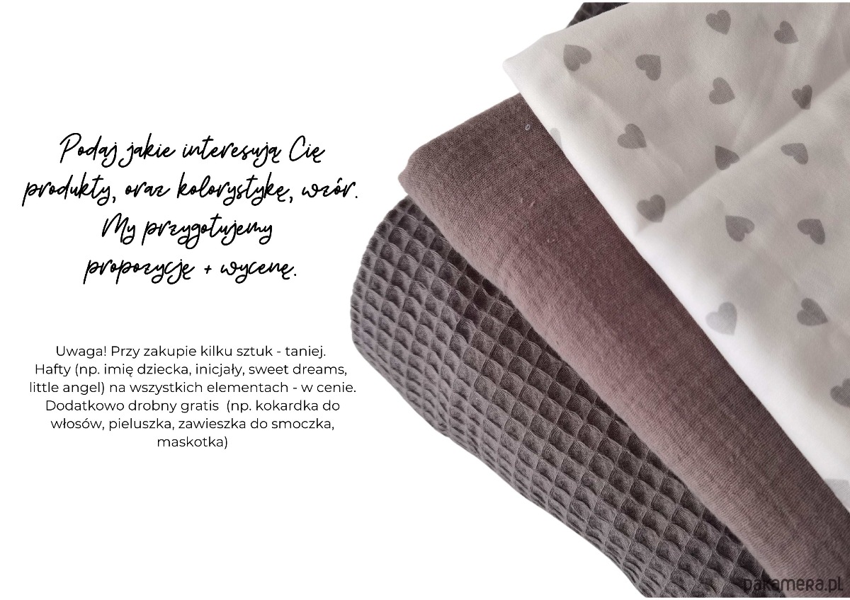 Inny kolor, wzór, rozmiar? Drugie prześcieradło do kompletu? A może cały personalizowany zestaw wyprawkowy z użyciem tego wzoru? Zapraszamy do kontaktu:)