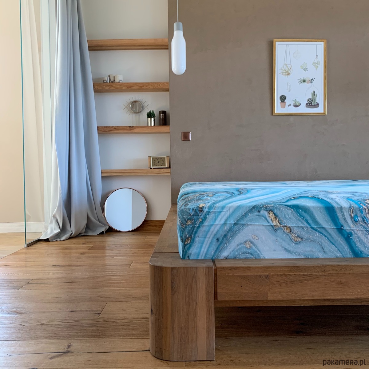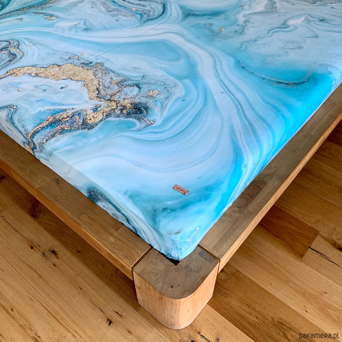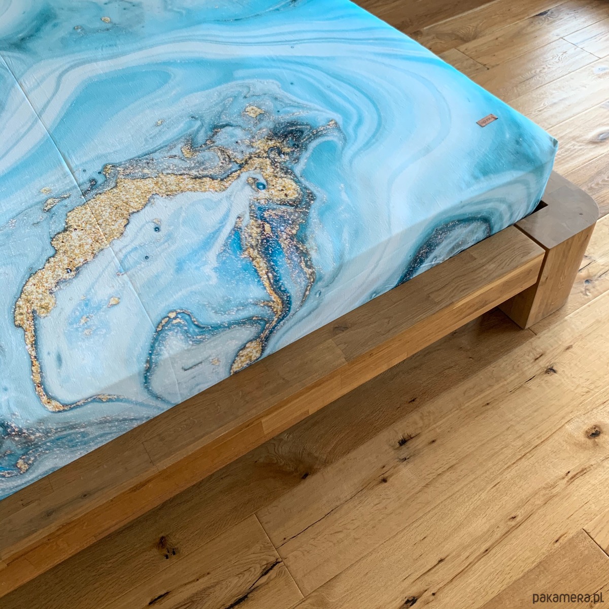 Prześcieradło z kolekcji Luxury Agate. Wzór artystycznej wersji niebieskiego agatu ze złotymi akcentami. Prześcieradło ma wszytą w rogach gumkę oraz zapas materiału nawet na bardzo wysoki materac.