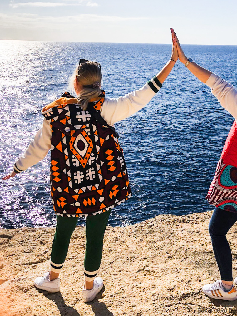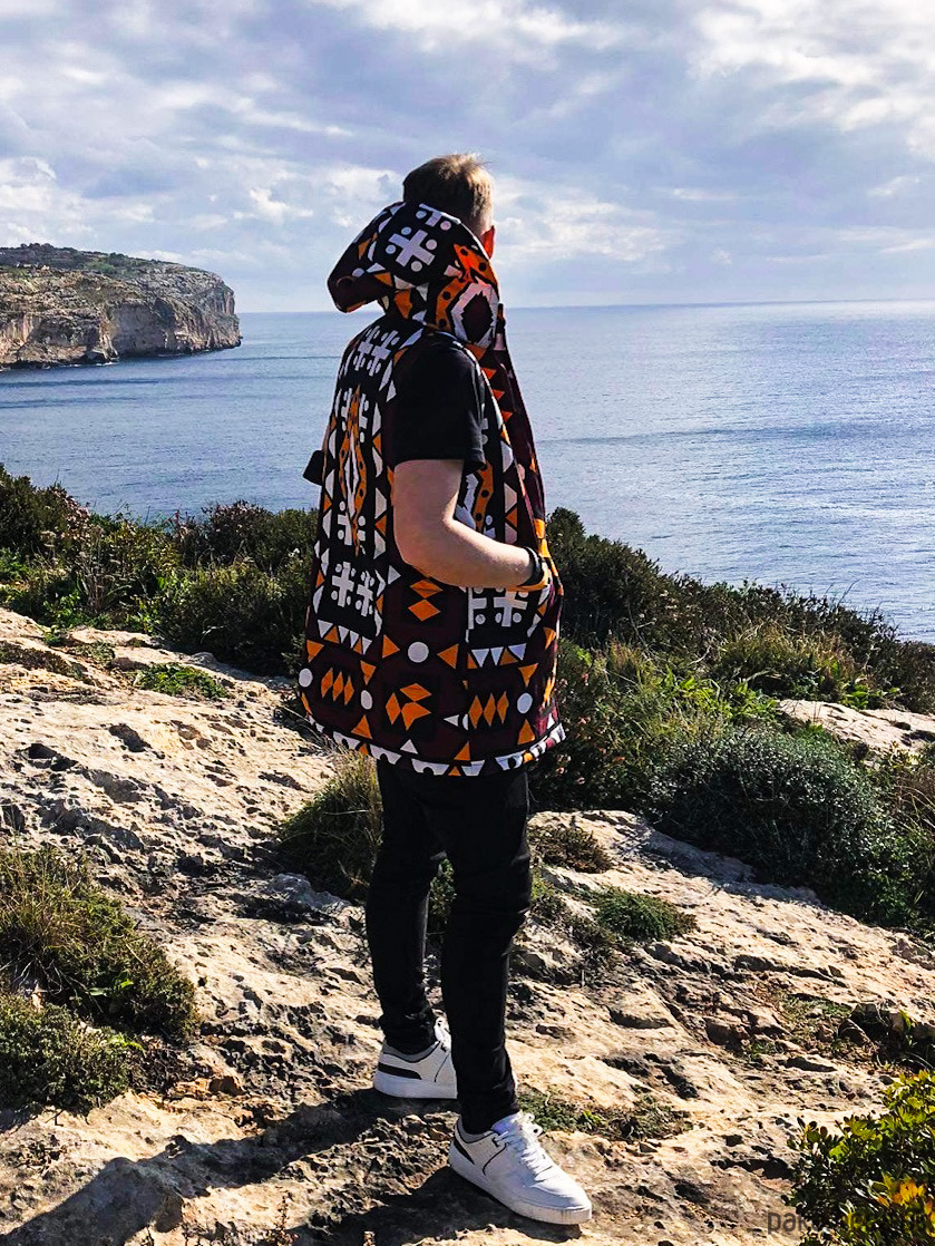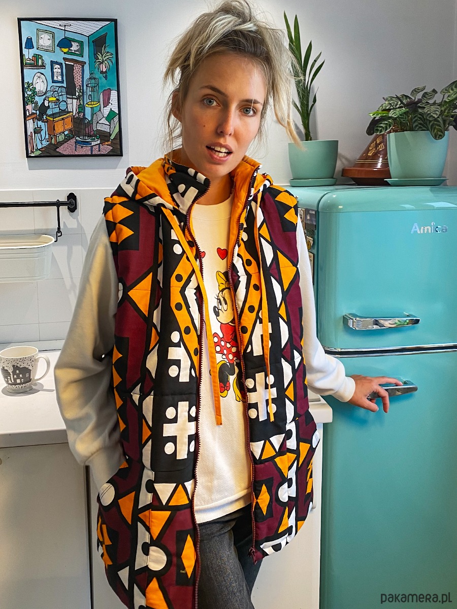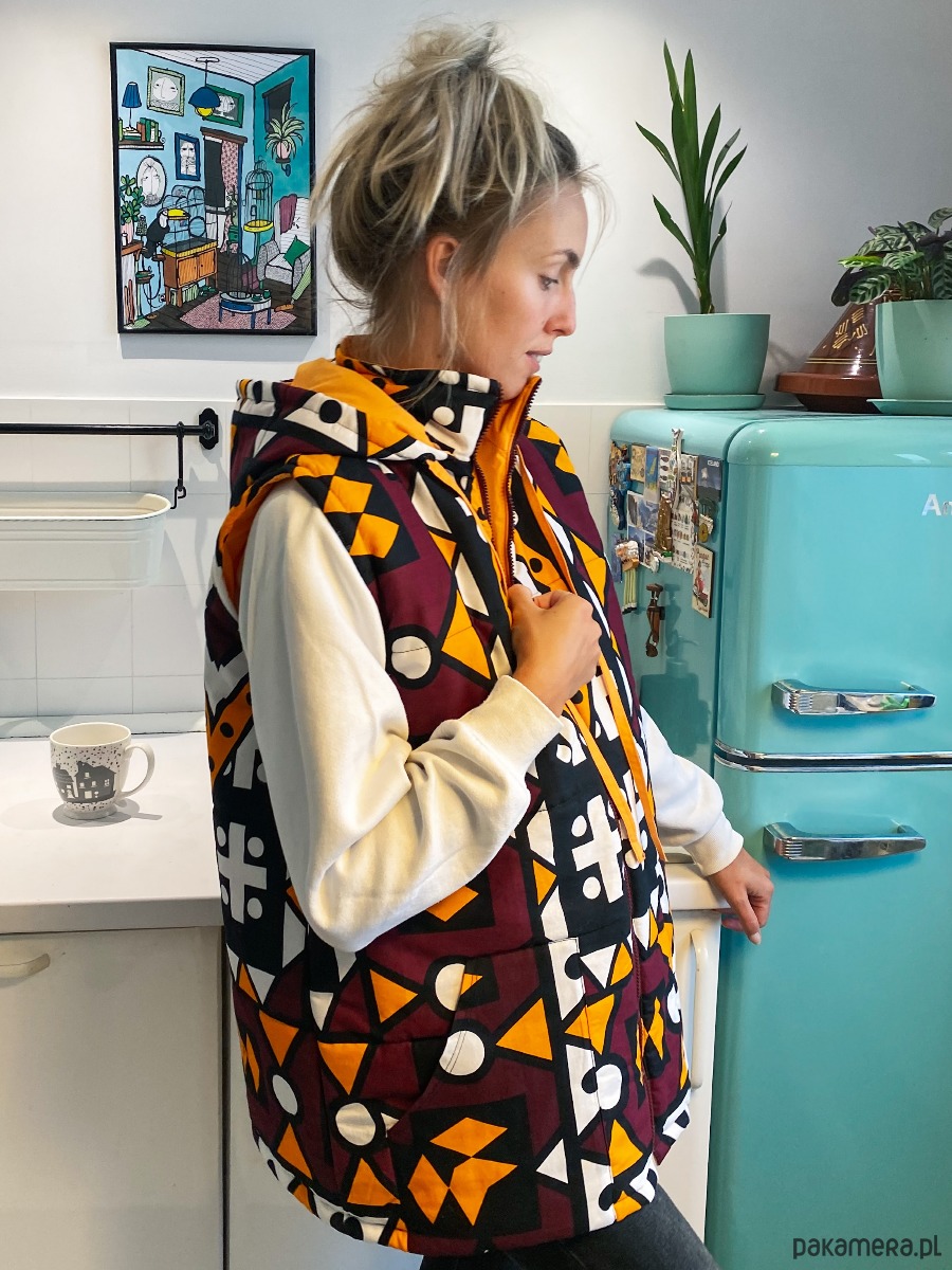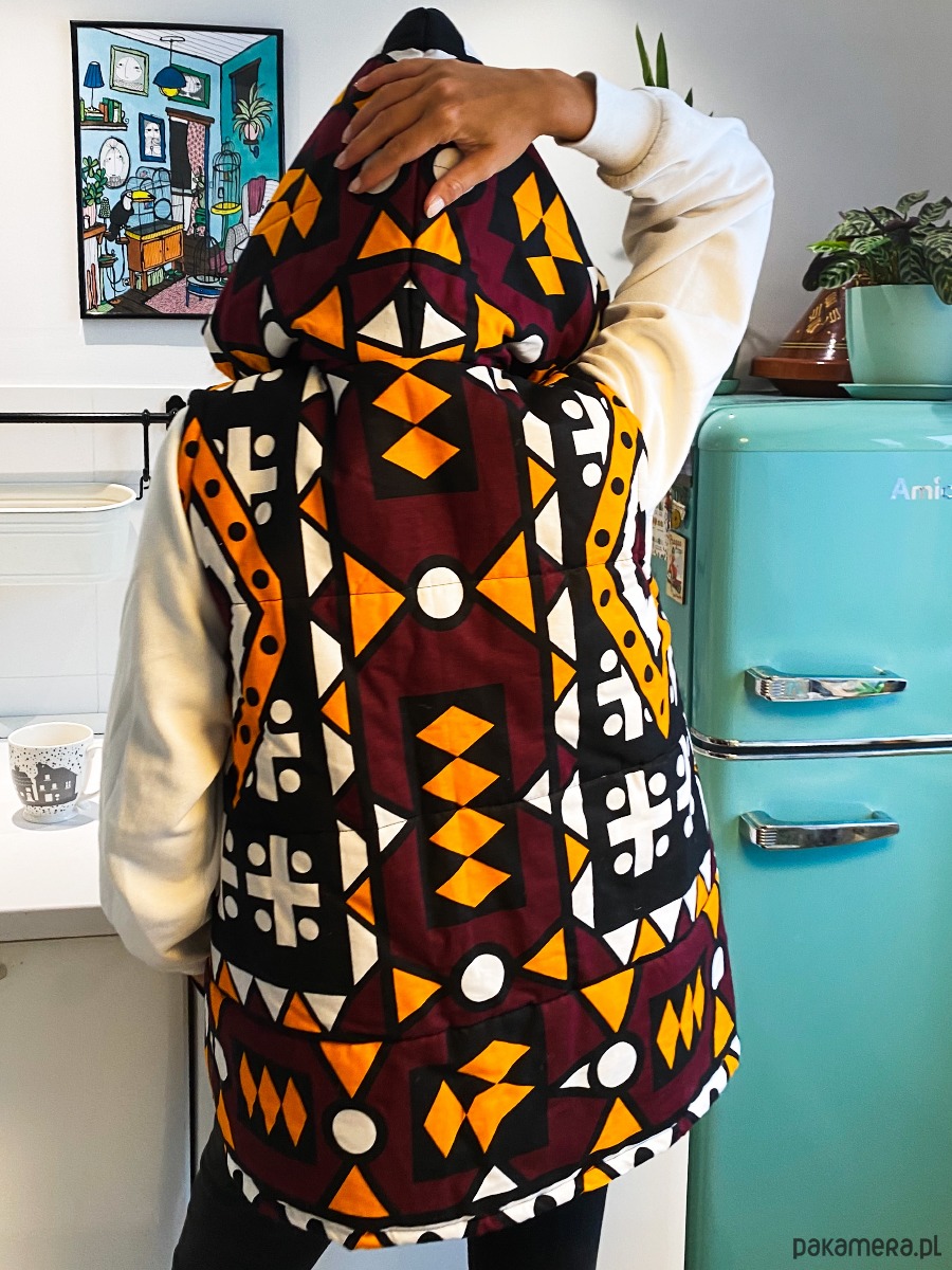 Bezrękawnik wykonany jest z soczyście kolorowej, bawełnianej tkaniny typu African Wax Print w połączeniu z jednolitą bawełną. W środku wypełniony ociepliną, a jego wewnętrzną stronę pokrywa pomarańczowa bawełniana podszewka.