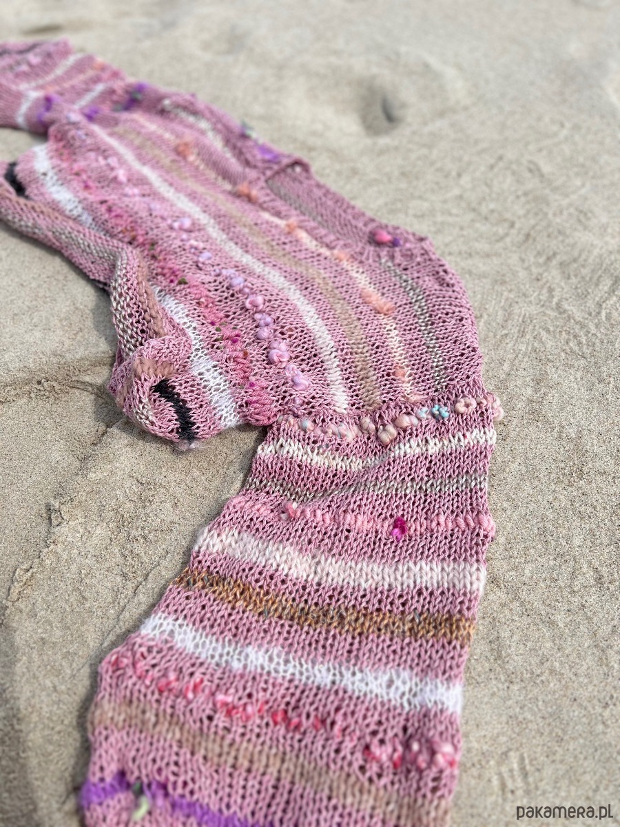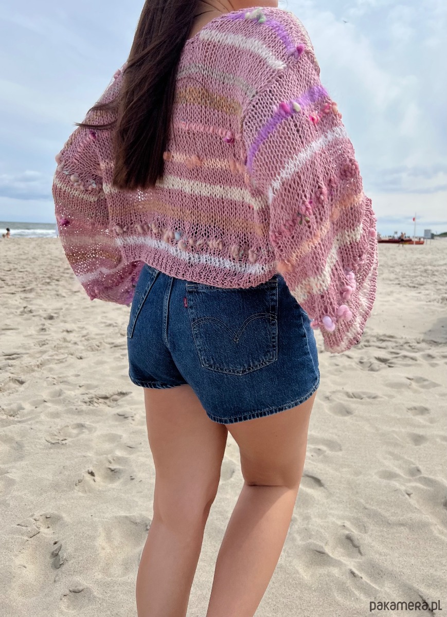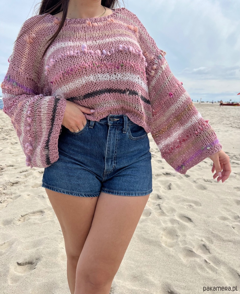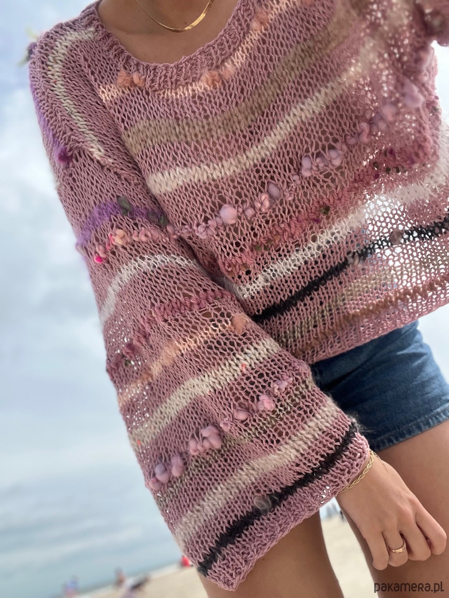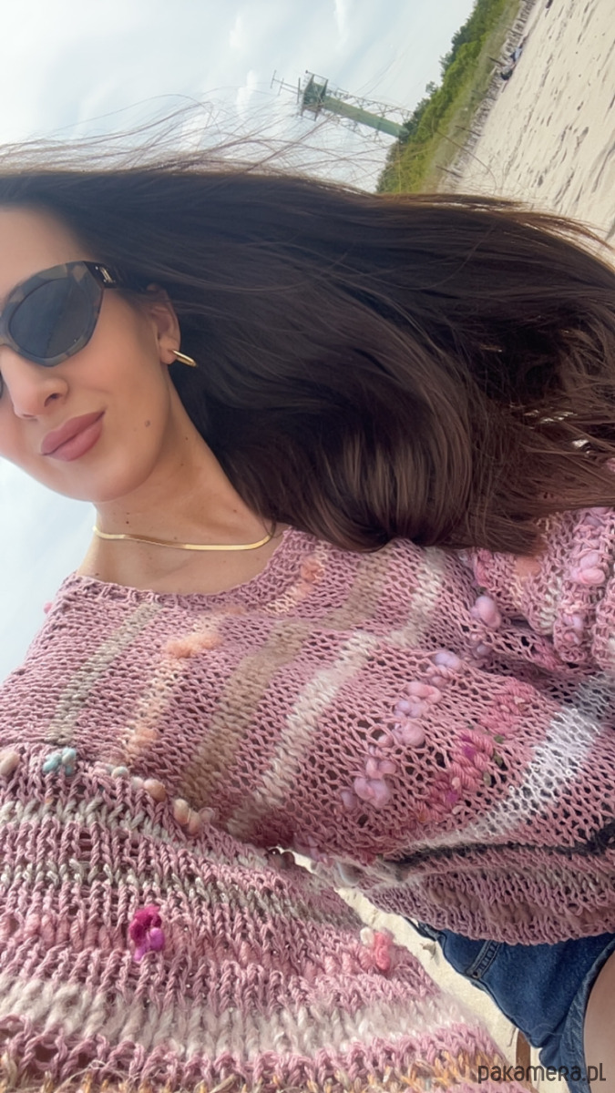Wyjątkowa propozycja - delikatna, przewiewna dzianina w pastelowych odcieniach różu i subtelnych akcentów sprawia, że jest to idealny wybór na letnie wieczory i dni. Sweterek w fasonie oversize z długimi rozszerzanymi rękawami wykonany z mnóstwa fantazyjnych włóczek, wiele z nich zrobione było na zamówienie co daje dużą gwarancję, że model pozostanie jedyny i niepowtarzalny. W bazie znajdziemy bawełnę wiskoze i len natomiast dodatki skrywają mieszanki wełny, akrylu, moheru, alpaki 🦙. Najlepiej prezentować się będzie na Paniach noszących na co dzień rozmiary s-l.