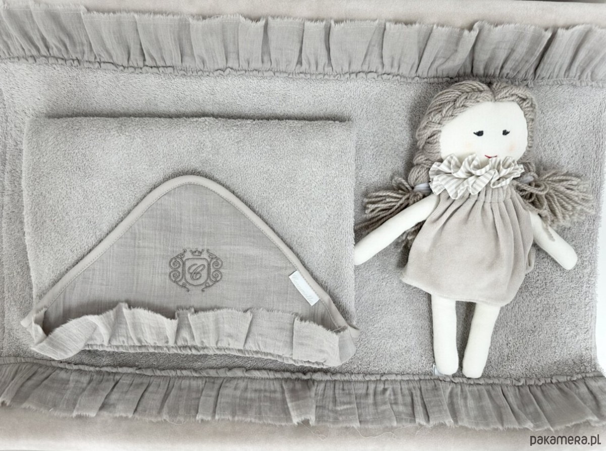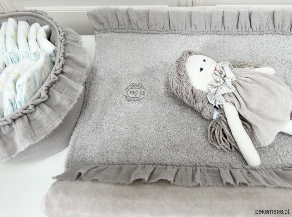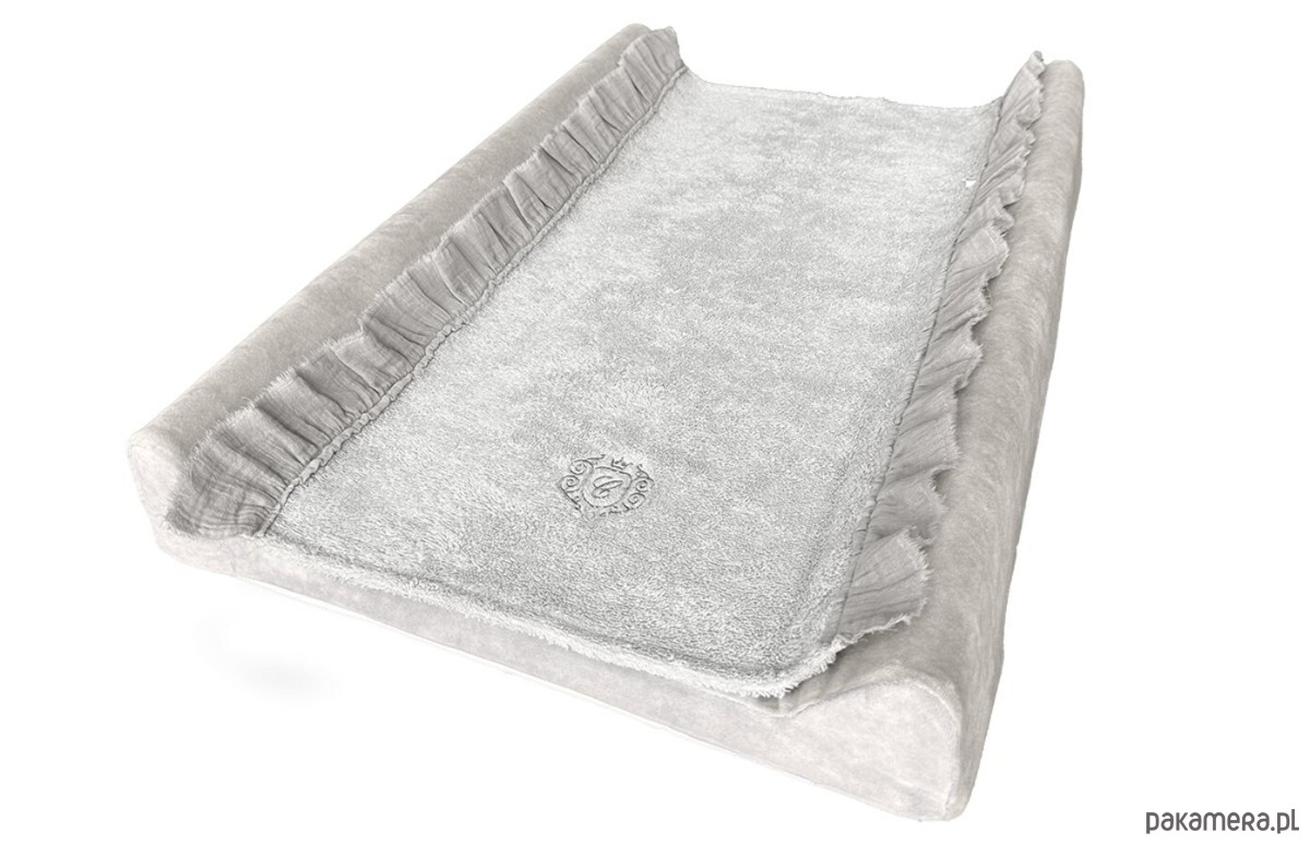 Przewijak do pielęgnacji dziecka, który łączy funkcjonalność z elegancją. Obszyty został miękkim welurem w odcieniu beżu, dzięki czemu prezentuje się wyjątkowo stylowo w pokoju maluszka. Dodatkowa nakładka z przyjemnej w dotyku tkaniny frotte zapewnia komfort i wygodę, a zdobiąca ją muślinowa falbanka oraz firmowy emblemat nadają całości subtelnego uroku. Wewnątrz znajduje się ceratowy wkład – nieprzemakalny i łatwy w czyszczeniu, wolny od szkodliwych substancji. Specjalnie profilowane boki dbają o bezpieczeństwo dziecka, a zdejmowany pokrowiec ułatwia utrzymanie czystości.