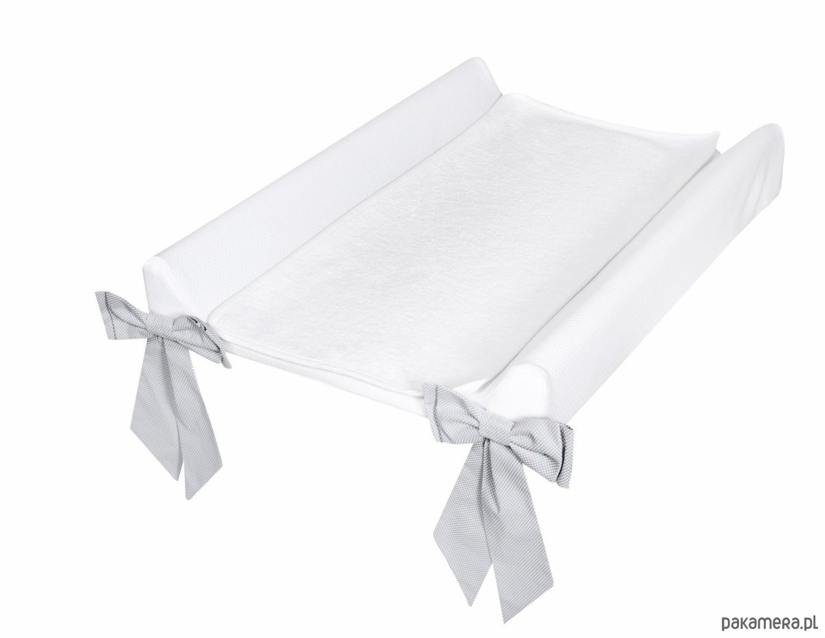 Przewijak do pielęgnacji dziecka, który doskonale łączy funkcjonalność z eleganckim designem. Wyposażony w miękki wkład obszyty nieprzemakalną, bezpieczną dla dziecka ceratką, pozbawioną szkodliwych substancji chemicznych. Wnętrze przewijaka wypełnia delikatna gąbka, a profilowane boczki zapewniają dodatkowe bezpieczeństwo maluszka. Pokrowiec został wykonany z białej tkaniny o gofrowanej strukturze i ozdobiony dekoracyjnymi, szarymi kokardami, które dodają całości subtelnego uroku. Jest zdejmowany i przystosowany do prania, natomiast kokardy mocowane są na rzep, co ułatwia ich odczepianie. To praktyczne i stylowe rozwiązanie, które sprawdzi się w każdej dziecięcej aranżacji. Idealne połączenie komfortu i estetyki!