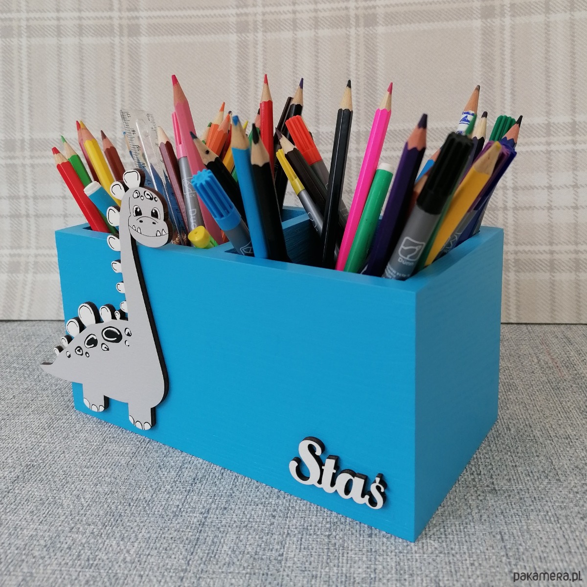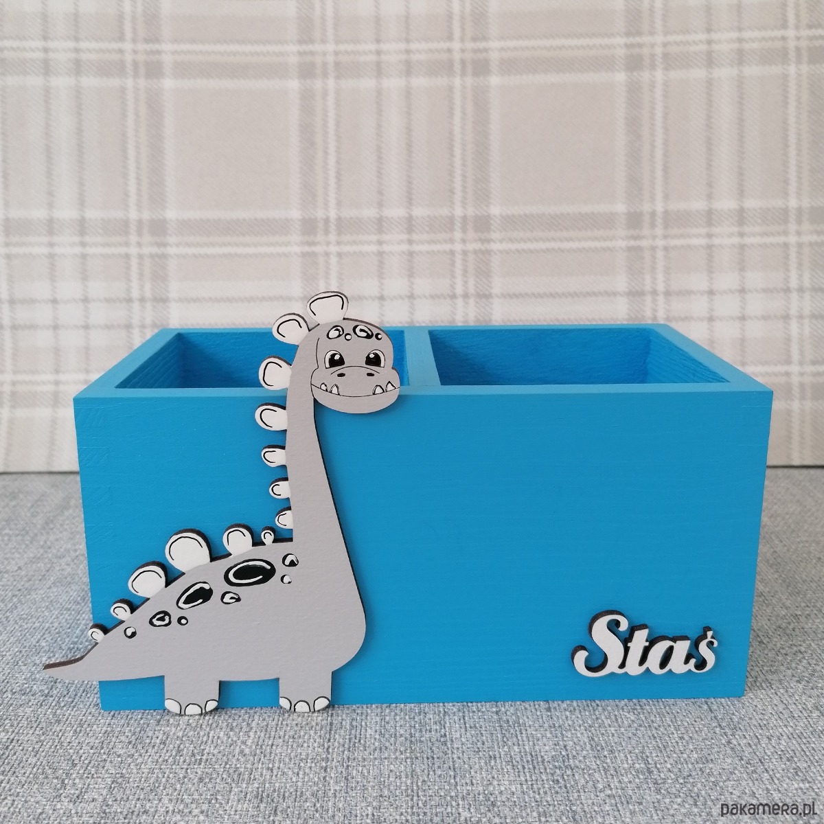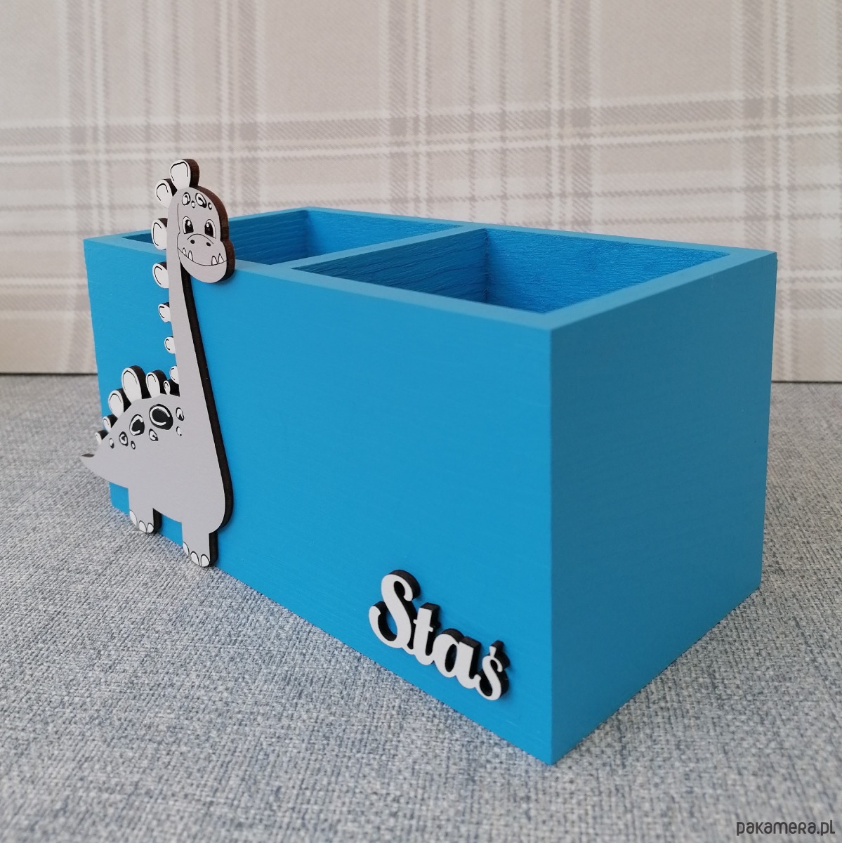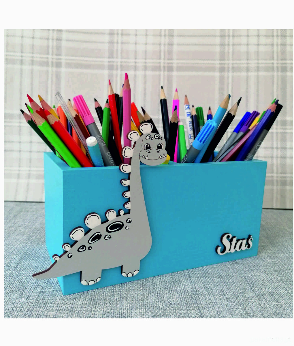 Przybornik został przez nas pomalowany na kolor niebieski a jego dodatkową ozdobą jest dekor dinozaura oraz imię dziecka, które należy podać przy składaniu zamówienia.