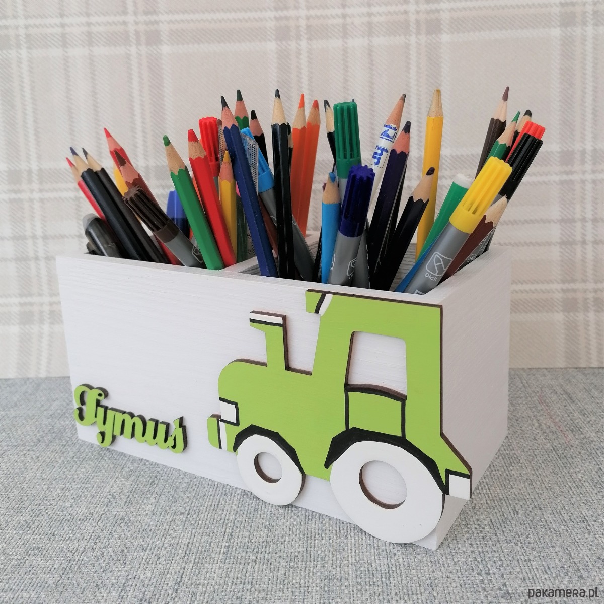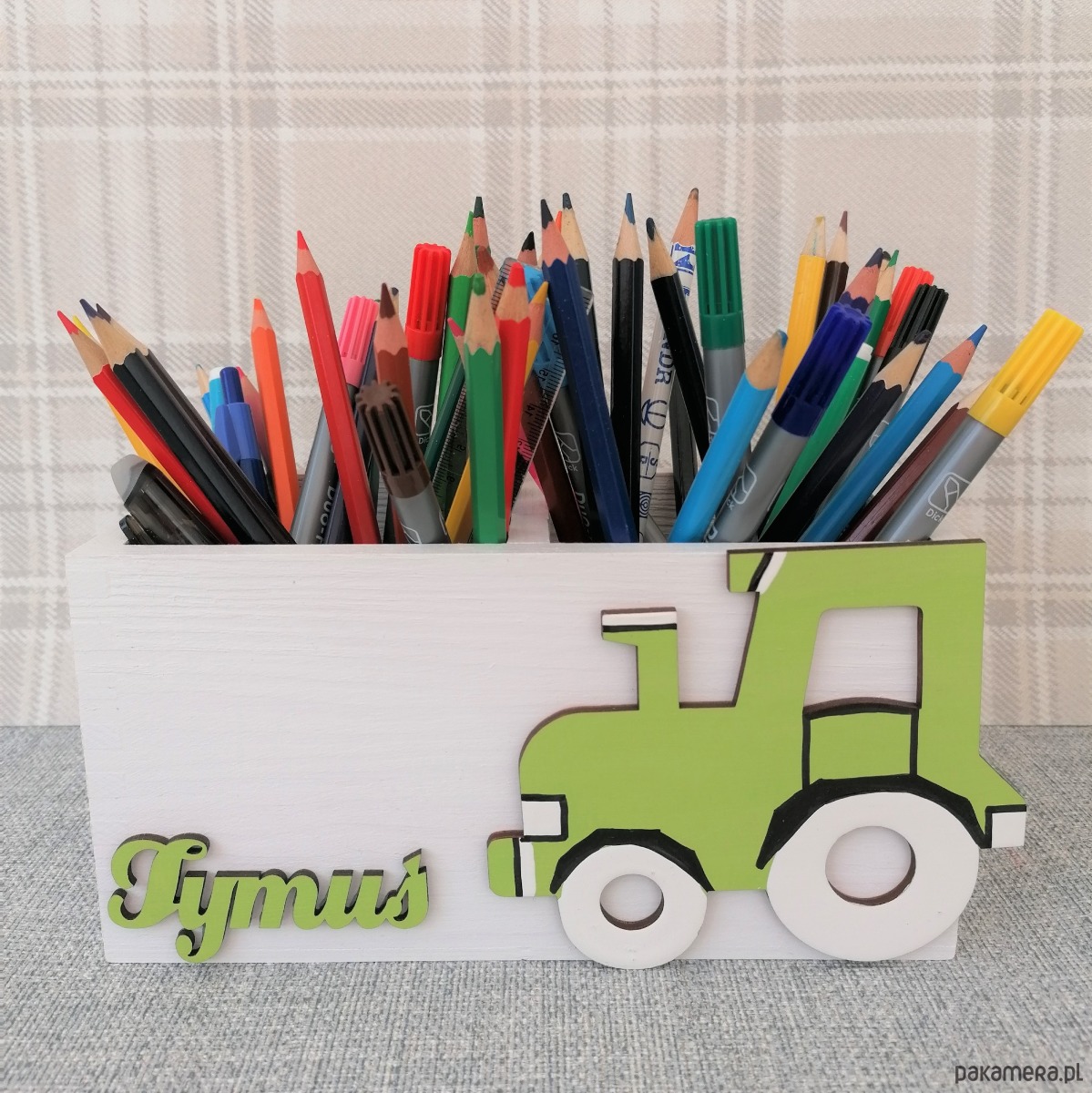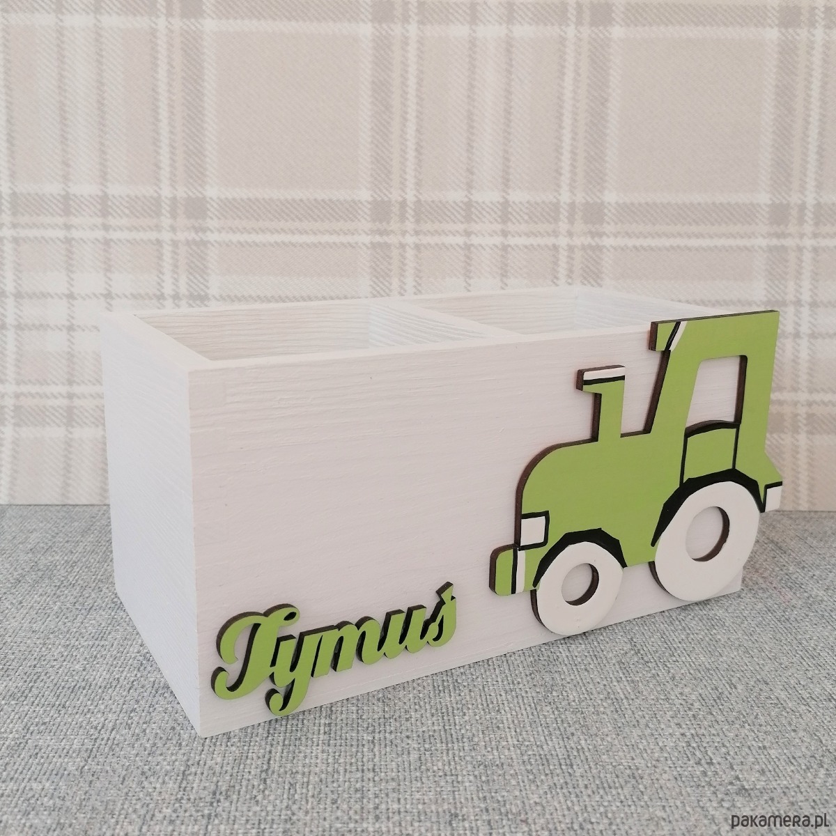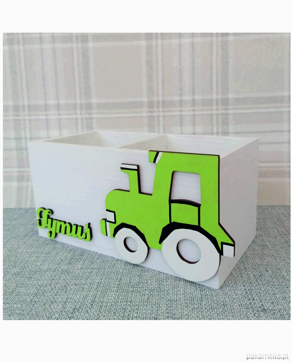 Przybornik został przez nas pomalowany na kolor biały a jego dodatkową ozdobą jest dekor traktorka oraz imię dziecka, które należy podać przy składaniu zamówienia.