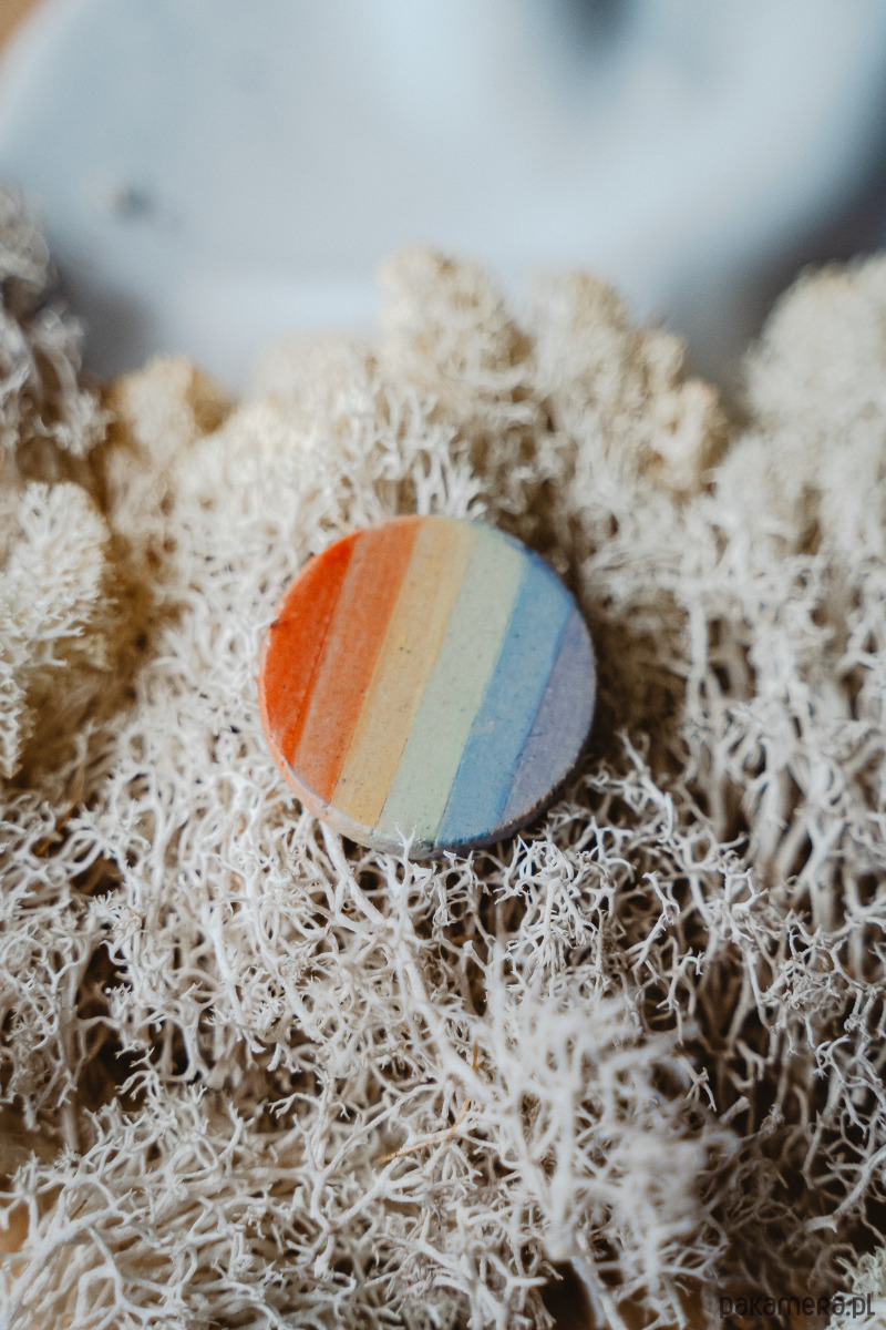 Ceramiczna przepinka w kolorach tęczy wykonana ręcznie z gliny, pokryta szkliwem.