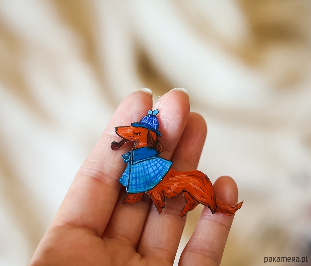 Przypinka z psim detektywem została ręcznie narysowana, dzięki czemu każda jest niepowtarzalna.