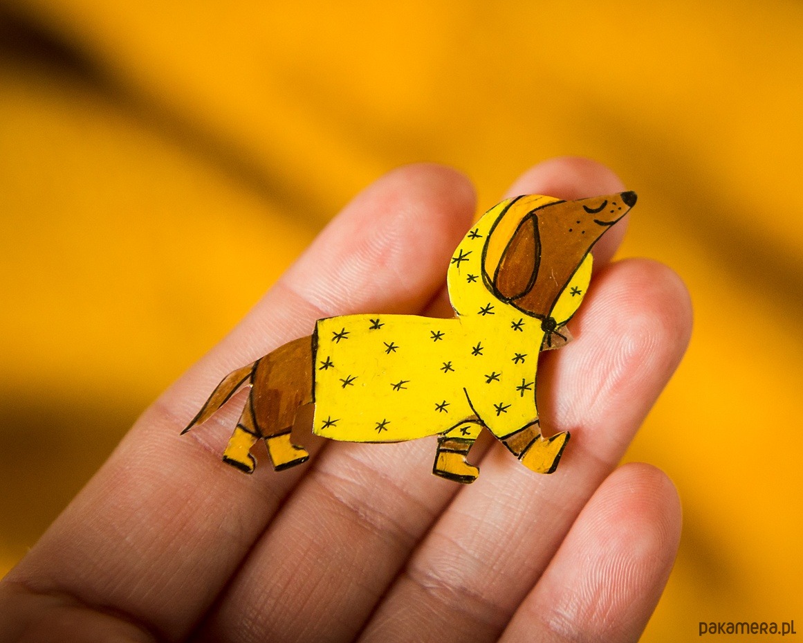 Ręcznie rysowana broszka z jamnikiem Tadkiem to prawdziwa perełka w świecie miniaturowej mody. Tadek, dumny jak paw (choć dużo dłuższy niż paw), pozuje w swoim ulubionym żółtym płaszczu.