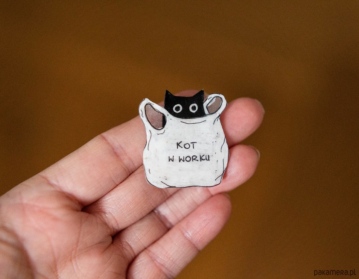 Ta zadziorna przypinka czarnego kota w białym worku wygląda, jakby ktoś próbował go spakować… ale kot oczywiście ma własne plany. Z miną „ja tu rządzę” i sterczącymi uszkami prezentuje pełen koci charakter: trochę chaosu, trochę uroku i dużo osobowości.
