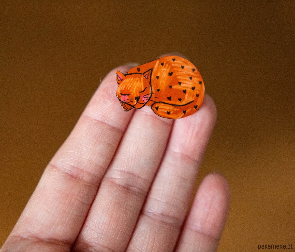 Przypinka z mini rudą, śpiącą kicią w serduszka. Urocza ilustracja przedstawia małą, rude futerko zwinięte w ciasny kłębuszek, z zamkniętymi oczkami i delikatnym uśmiechem. Kotka jest ozdobiona drobnymi serduszkami, które dodają całości ciepła i słodkiego charakteru. Przypinka ma miękki, przyjazny styl i świetnie sprawdzi się jako drobny, pełen uroku dodatek do plecaka, kurtki czy torby.