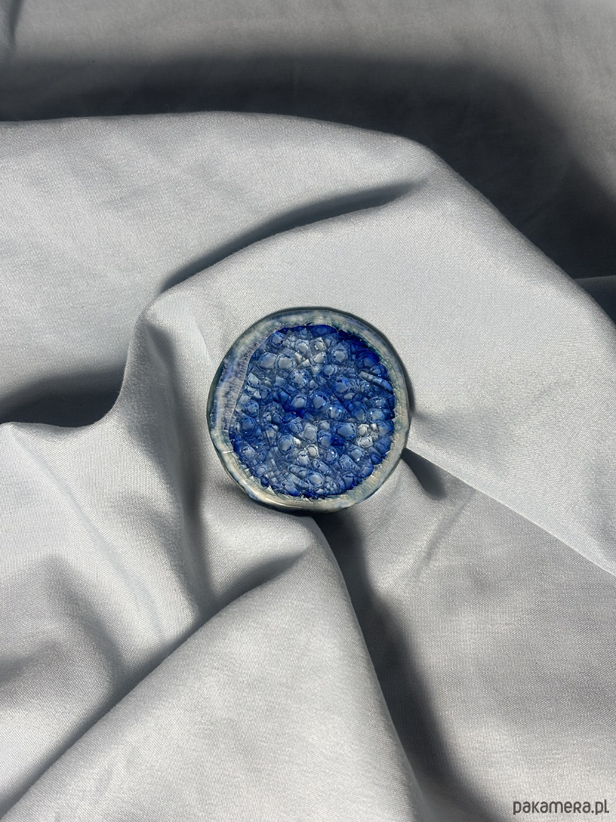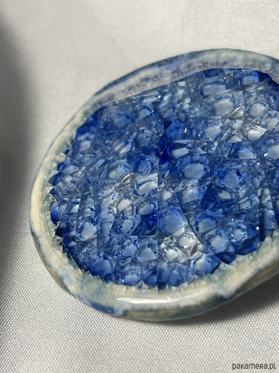 pokryta błękitną angobą, następnie szkliwem indygo przykrytym białym i błękitnym szkłem hutniczym