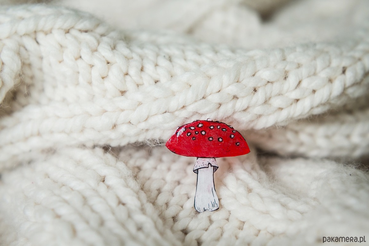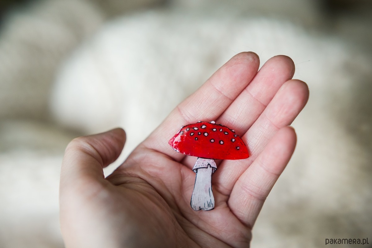 Przypinka z grzybkiem muchomorkiem została ręcznie narysowana, dzięki czemu każda jest niepowtarzalna.
