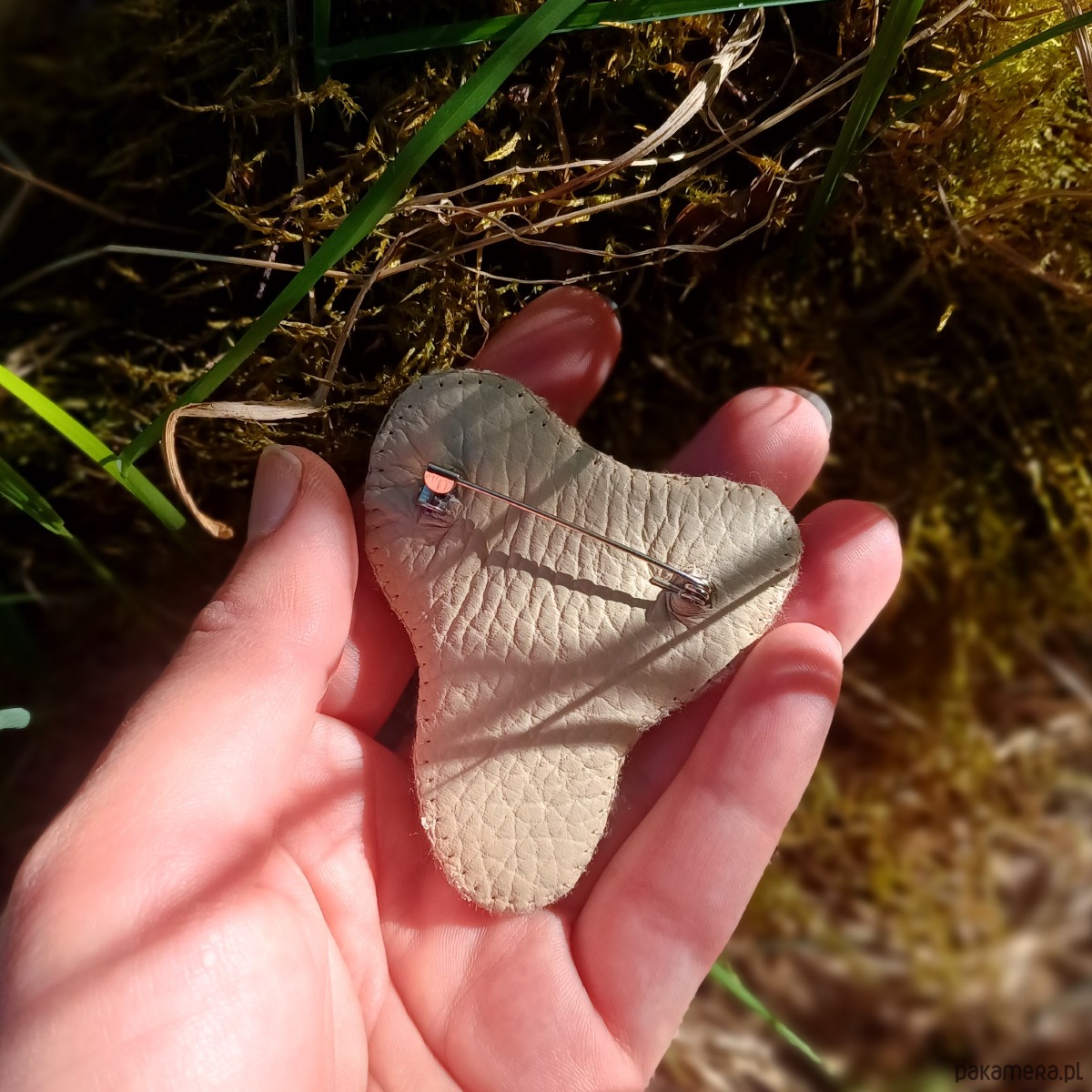 Materiał: naturalna wełna czesankowa, bawełniany kordonek nabłyszczany, skóra naturalna (resztki z tapicerowania mebli), metalowe zapięcie broszkowe