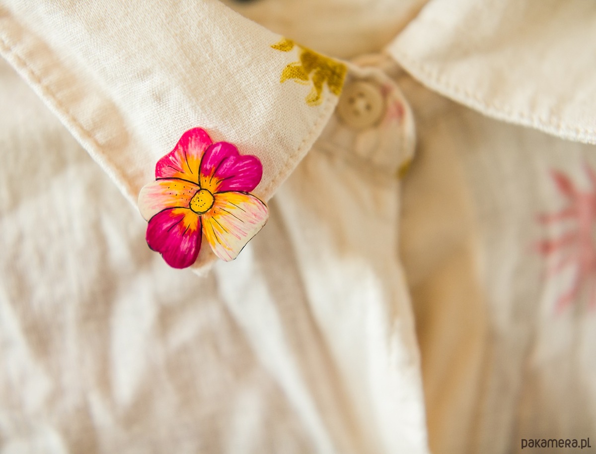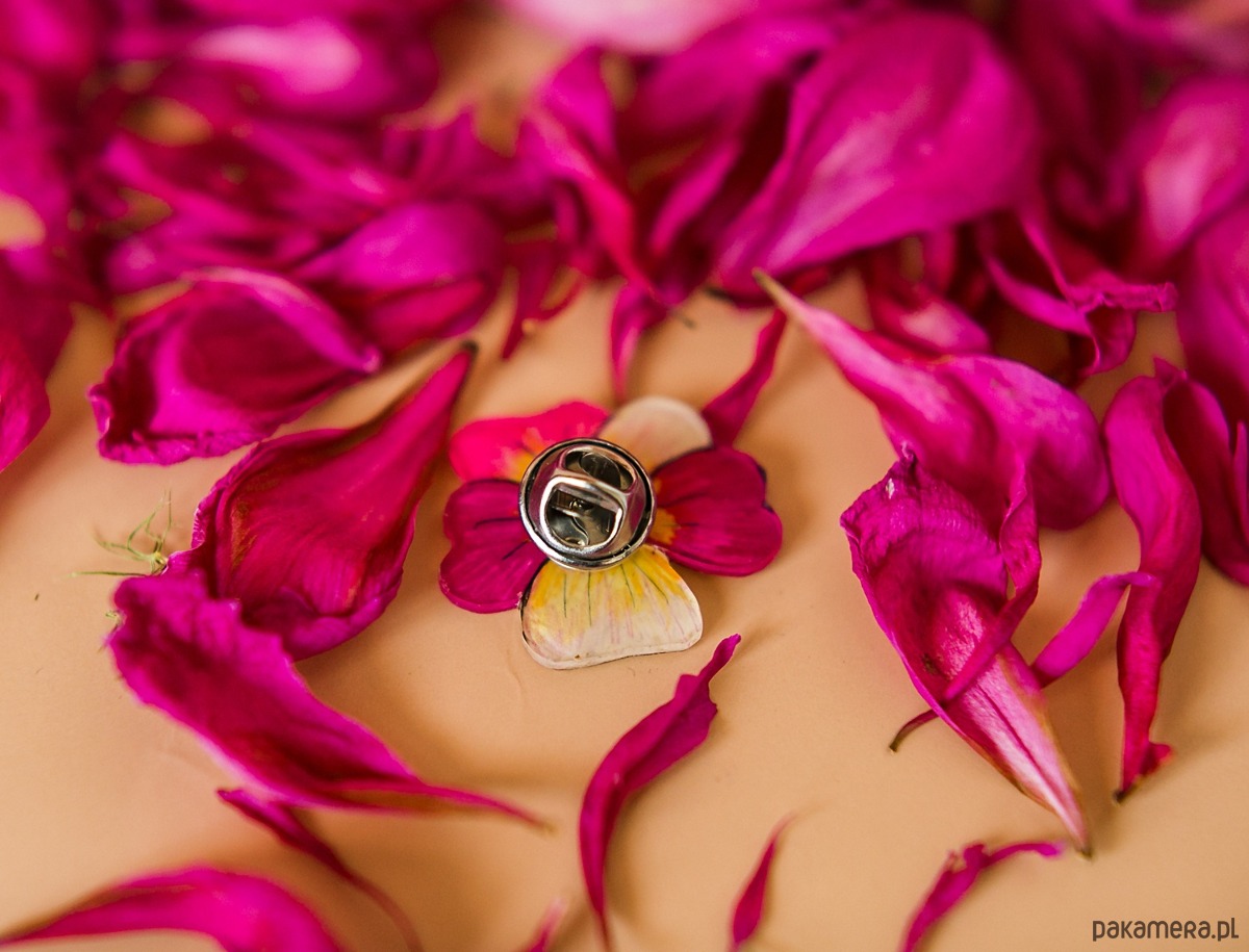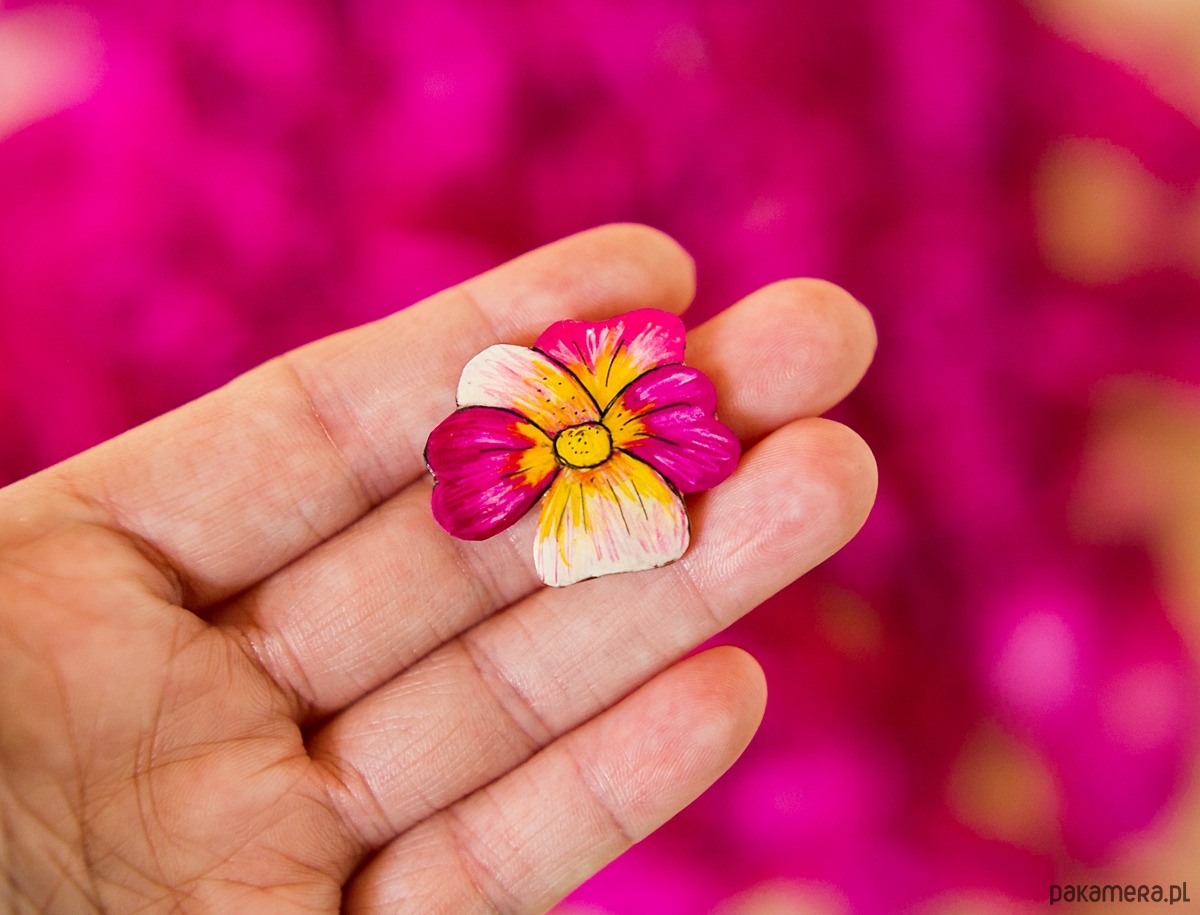 Przypinka z małym bratkiem będzie słodkim dodatkiem do letniej garderoby.