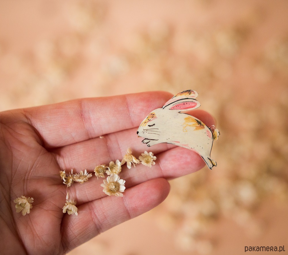 Przypinka z zajączkiem Kasią została ręcznie narysowana, dzięki czemu każda jest niepowtarzalna.