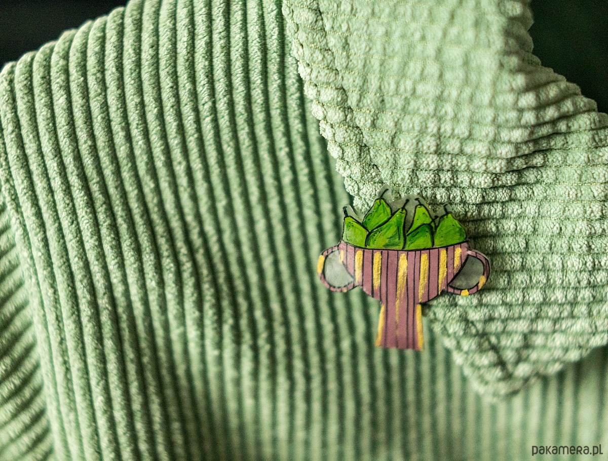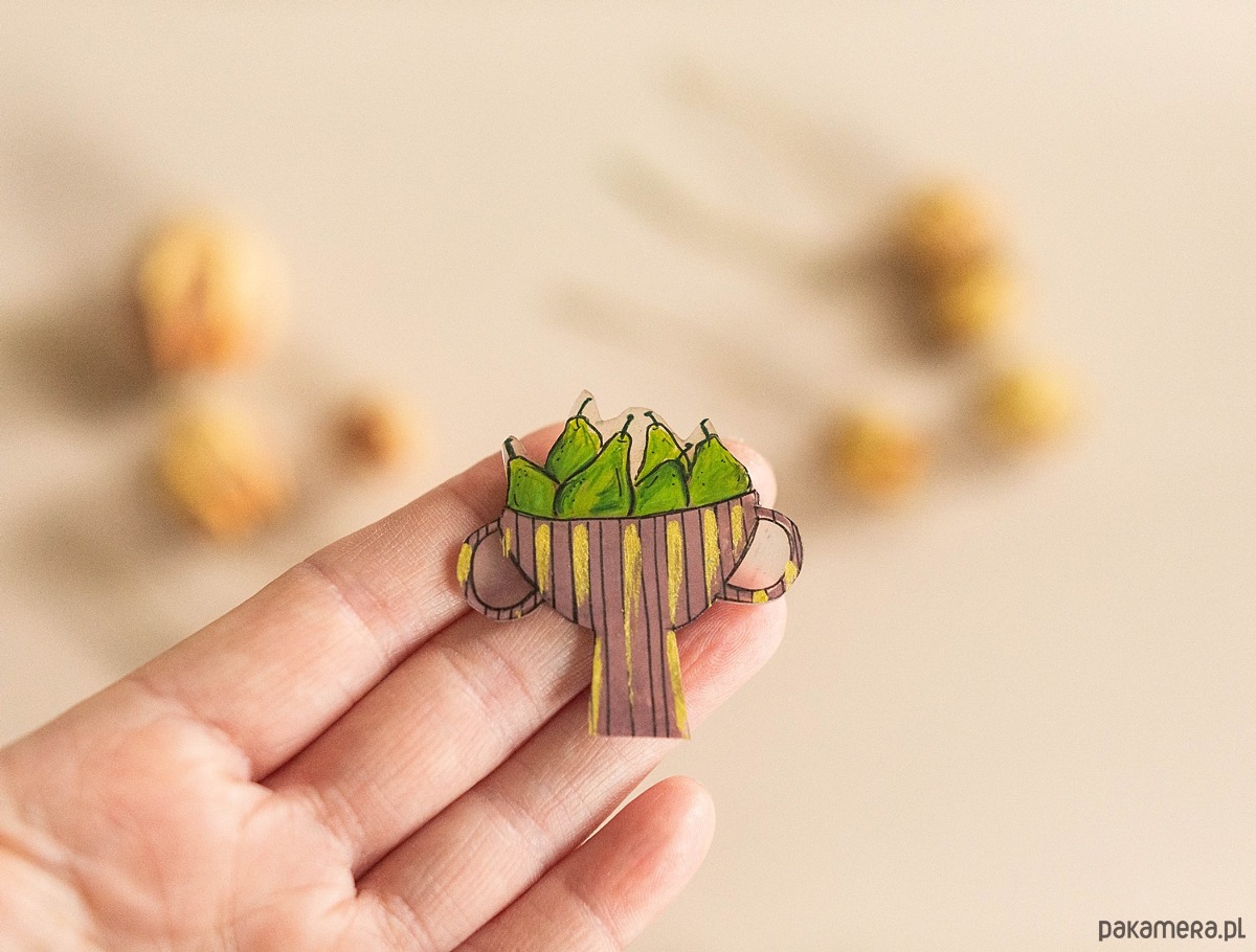 Oryginalna broszka ręcznie rysowana, zabezpieczona lakierem ekologicznym. Powierzchnia broszki jest błyszcząca.