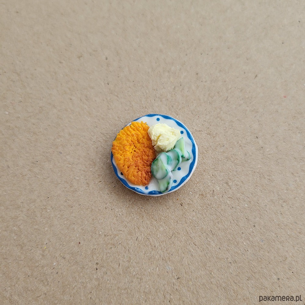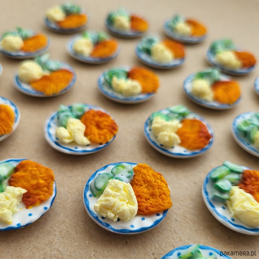 Talerzyk wykonany jest z ceramiki, zaś elementy imitujące jedzenie z modeliny.