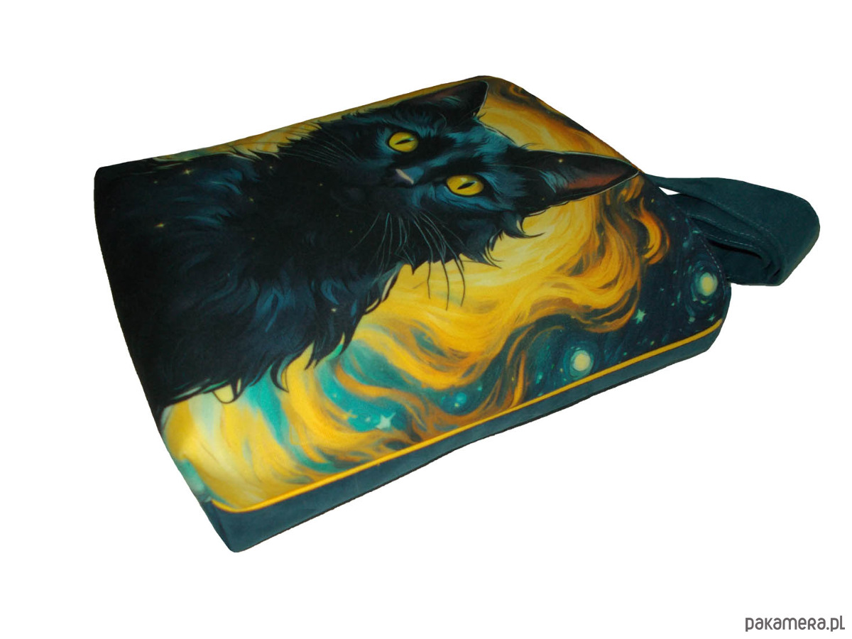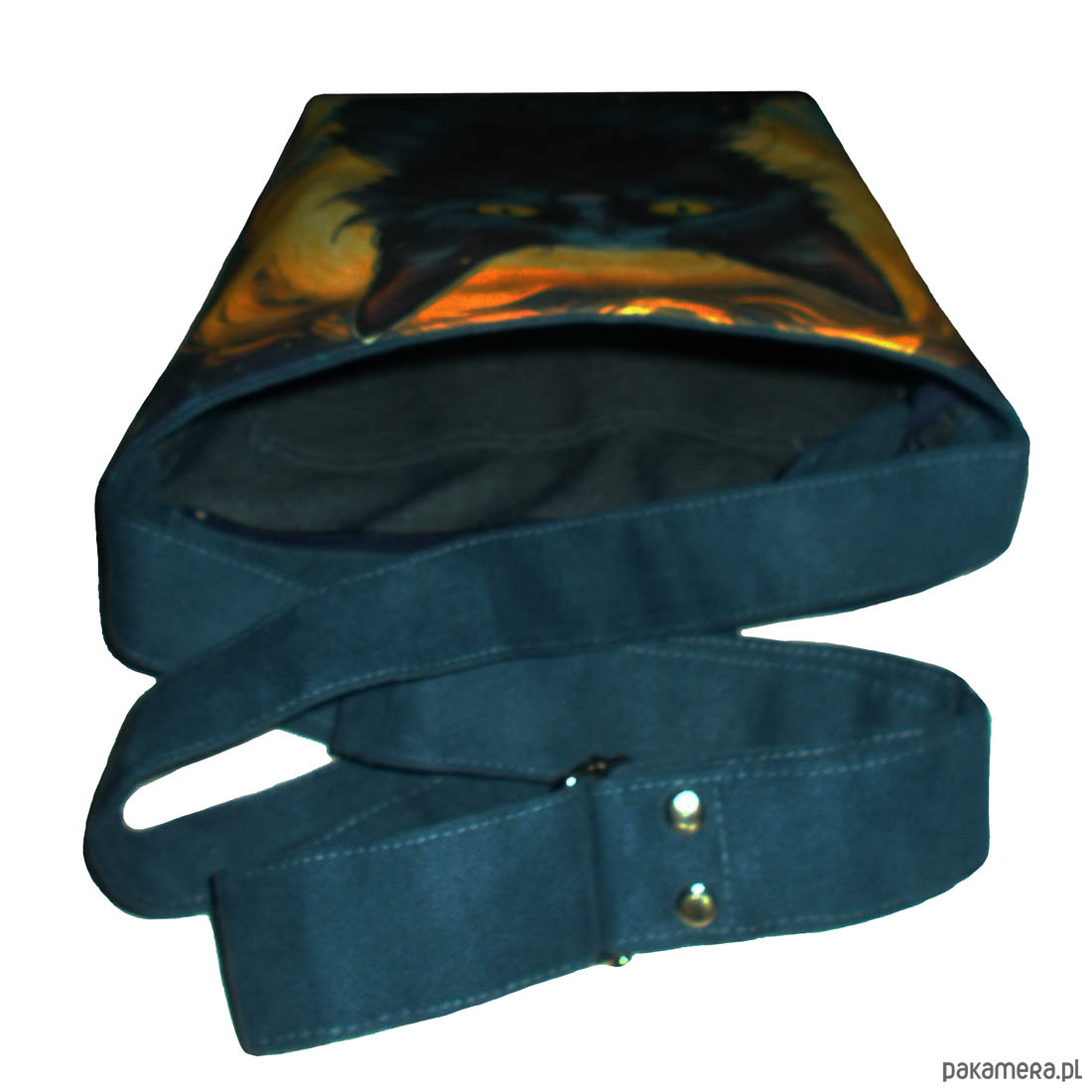 Autorska torba z usztywnionego eko zamszu, zapinana na zamek. Przód z weluru tapicerskiego. Pasek regulowany. Tył w kolorze paska (niebieski). Torba trzyma fason. Wewnątrz dwie kieszenie - jedna na zamek, druga z miejscem na telefon i coś jeszcze. W szwach wypustka. Denko poszerzone. szerokość 32cm wysokość 30cm plus denko 8cm
