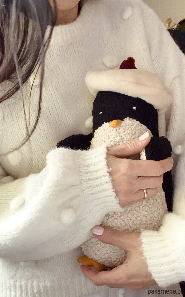 Cały pingwinek wykonany jest z miękkiego materiału boucle z certyfikowanych materiałów pochodzących wyłącznie od polskich producentów.
