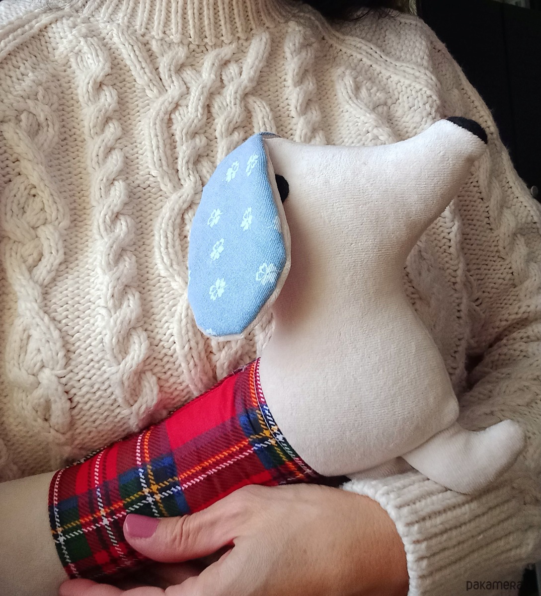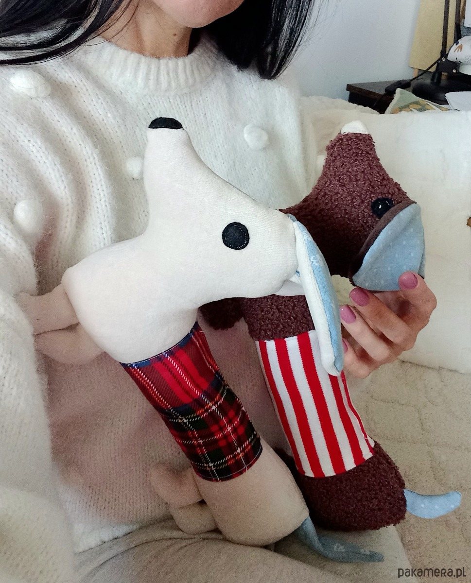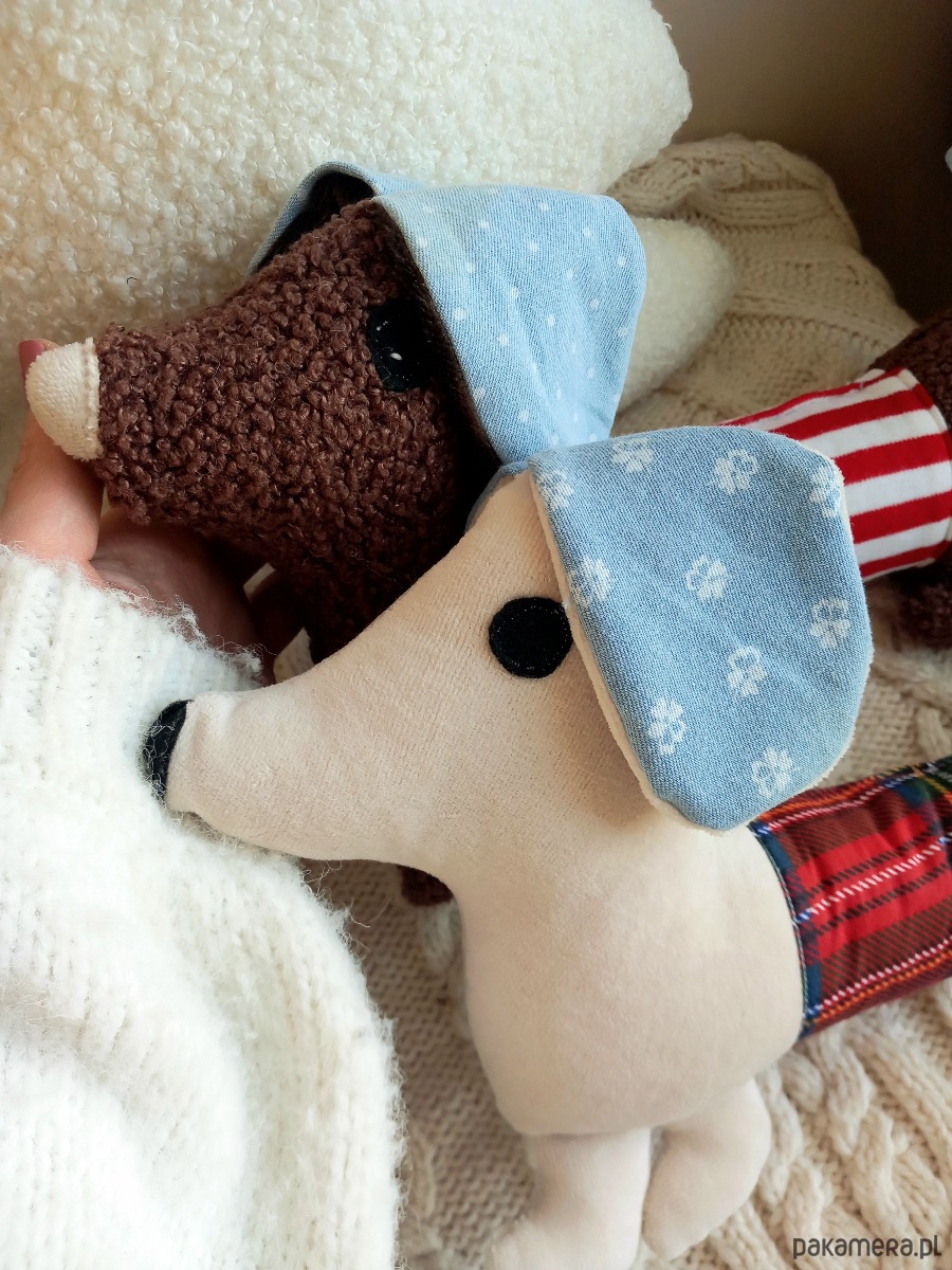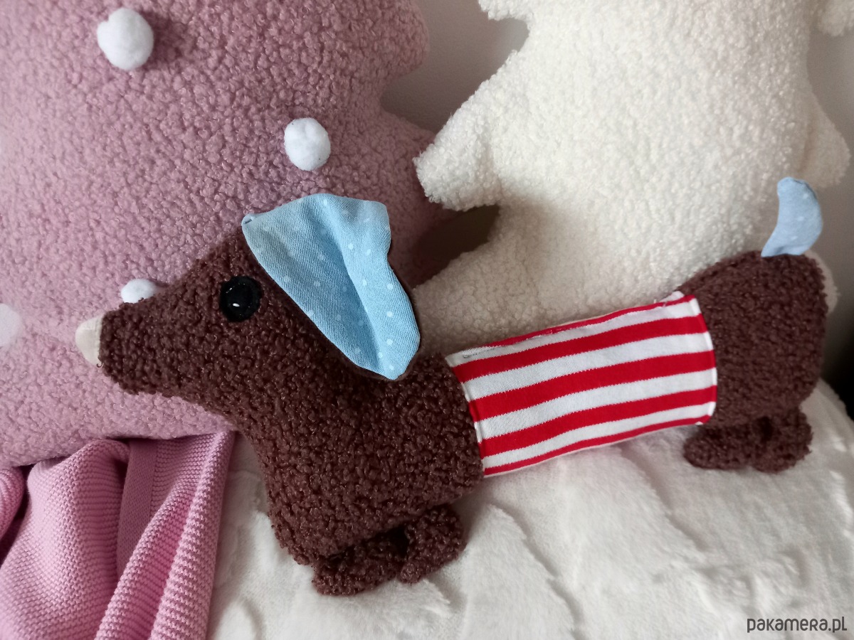 Zabawna a zarazem pocieszna przytulanka jamniczek. Sierść jamniczka została wykonana z niesamowicie miłego w dotyku tkaniny boucle oraz minky.
